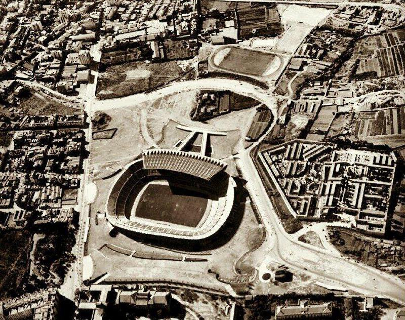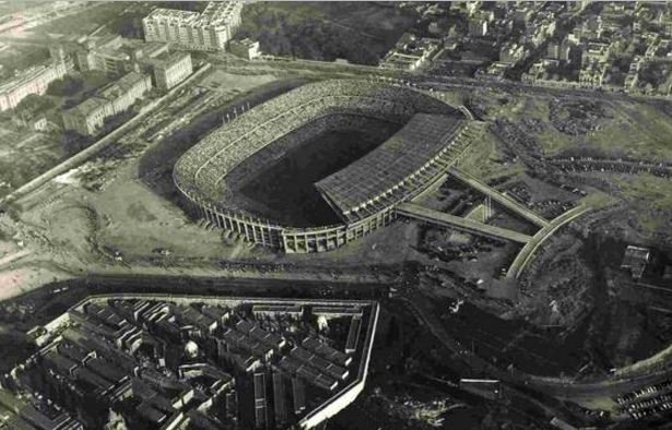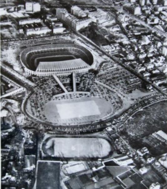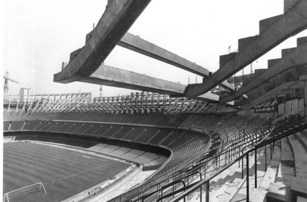 Back in the early 1950s, when the Camp Nou was first conceived, there was something of a stadium boom taking place in Iberia. First off the mark was Real Madrid with their new stadium at Chamartin (It was opened in 1947, but was extended in 1953). Portuguese giants Benfica opened their Estadio Da Luz in 1954, and supporting acts were provided in the form of Sevilla’s Estadio Ramón Sánchez Pizjuán and Sporting Lisbon’s Estadio José Alvalade. Barça, even with their souped-up version of the Camp de Les Corts and its 60,000 capacity, were wary of being left behind and very nearly over-committed to the building of the new stadium, which in part, led to the barren years on the pitch during much of the 1960s. The first stone at the Camp Nou was laid on 28 March 1954, and the proposed 66 million peseta project was to be financed entirely by club socios. Designed by local architects J. Soteras Mauri & F. Mitjans Miro, it would feature two huge tiers and a modern cantilevered roof over the west side.