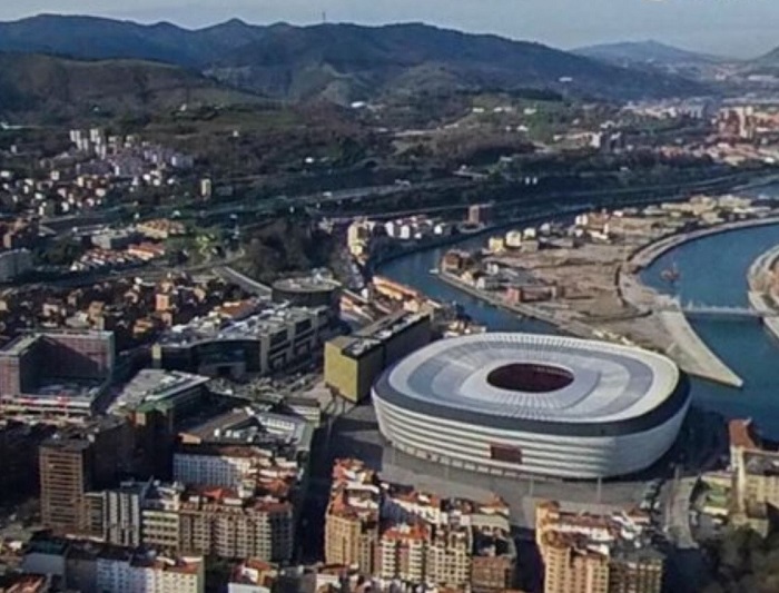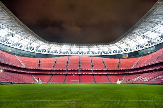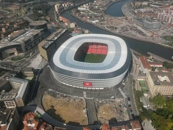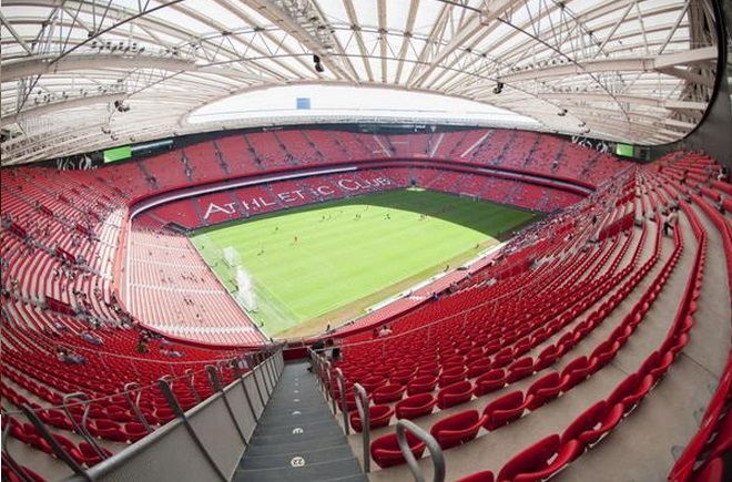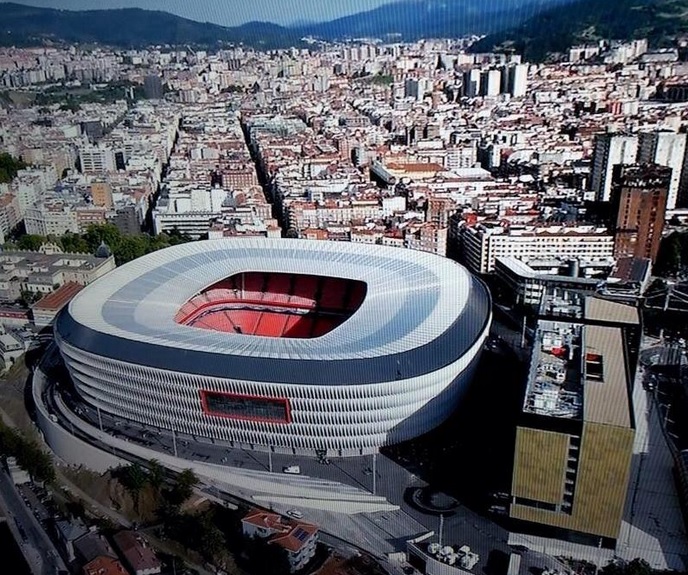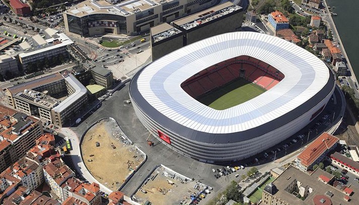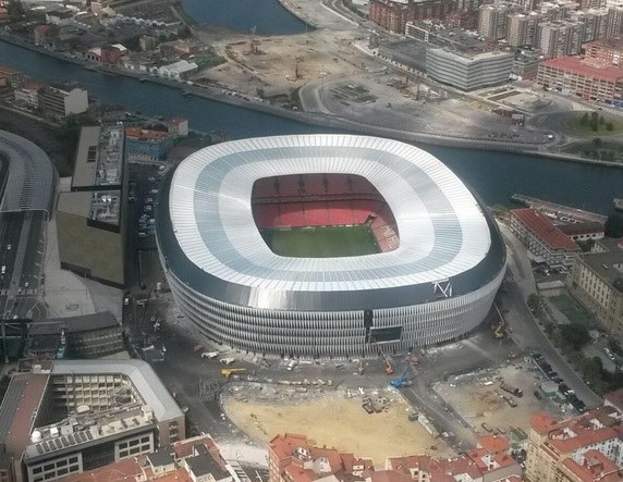 The site of the new stadium is sandwiched between the northwest side of the fabled San Mamés stadium and the southern bank of the Rio Nevrion. As this land falls away sharply towards the river (a drop of some 8 metres), much of the initial work was spent on building up the foundations and retaining walls. By the autumn of 2012, the lower tier was in place… well, three sides were in place. So close was the proximity of the new building to the site of the existing stadium that initially, only three sides could be developed. Despite valiant efforts, the new San Mamés was not ready for the start of the 2013-14 season, so Athletic played its first “home” match at arch-rivals Real Sociedad’s Anoeta stadium. The stadium finally opened on 16 September 2013 with an exhilarating league match with Celta Vigo, which Athletic won 3-2. Demolition of the old San Mamés had commenced at the beginning of June 2013, and work on the fourth side of the ground continued throughout the 2013-14 season. Excellent home form at the new San Mamés undoubtedly contributed to Athletic’s excellent fourth-place finish, which earned a place in the UEFA Champions League. With pleasing symmetry, Athletic’s home qualifier against Napoli on 27 August 2014, coincided with the opening of the final piece of this €210m jigsaw.