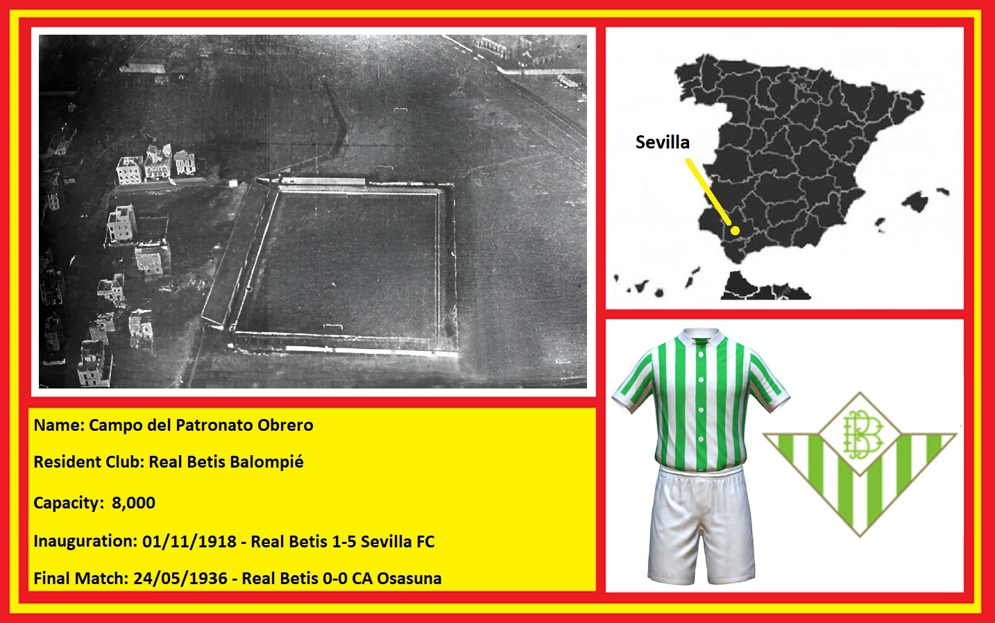 The club was founded by students from the local Polytechnic Academy on 12 September 1907. They were originally called España Balompié (Balompié being derived from the Spanish translation of ball & foot – balón & pie) and set up home at the Campo del Huerto de Mariana. In 1909, they moved to the Campo del Prado de Santa Justa, changing their name to Sevilla Balompié. They were on the move again in 1911, switching to the Campo del Prado de San Sebastián, which was an area of open parkland also used by many of the city’s clubs, including their eternal rivals, Sevilla FC. In 1914, the club absorbed several smaller teams, including Betis Foot-Ball Club, which had been formed by disgruntled members of Sevilla FC. The merger led to the club changing its name to Real Betis Balompié after receiving royal patronage on 17 August 1914. The club continued to use the Campo del Prado de San Sebastián until 1918, when it moved to its first substantial home, the Campo del Patronato Obrero.