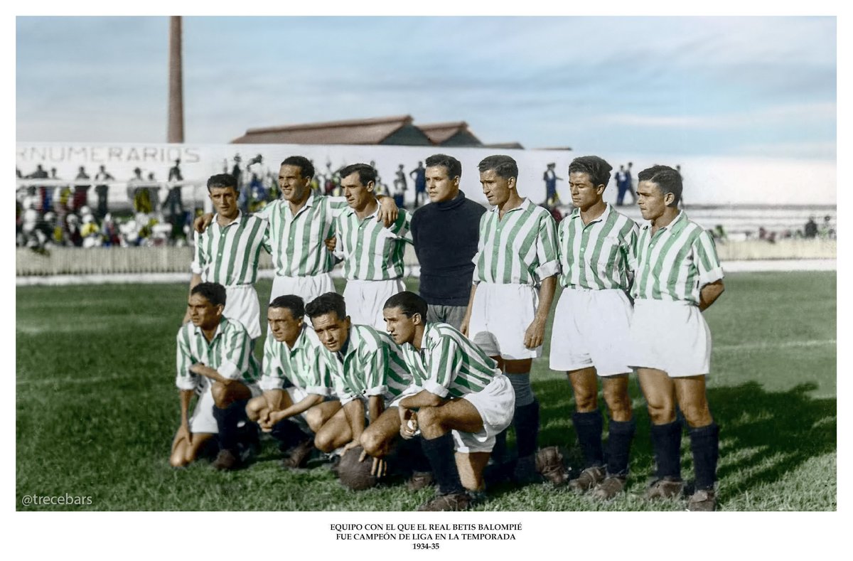 Betis won the Andalucian championship in 1928 and was a founder member of La Segunda in 1929. In 1931, Betis became the first club from the south of the country to reach the final of the Copa, losing 1-3 to Athletic Club at Real Madrid’s Campo de Chamartín. Betis won La Segunda title in 1932 and thus became the first club from the south of the country to play in the top tier of Spanish football. However, this was all eclipsed by the achievement of the 1934-35 season. Under the stewardship of Irishman Patrick O’Connell, who had been at the helm since 1931, Betis had developed a strong defensive game, helped by a core of former Basque players who had moved to Andalucia. This strength was reflected in their opening five matches, which all resulted in victory with just one goal conceded. Betis hit the top of the league in Week 3, and remained top going into the final fixture, away to Racing Santander. On the evening before the match in Santander, O’Connell met with Racing’s officials, having managed the club for seven seasons from 1922. The next day, Betis romped to a 5-0 victory. Real Madrid protested that O’Connell had bribed his old team to throw the game. Betis, in turn, accused Real Madrid of offering Racing a win bonus. The result stood, and Betis took their first and to date, only league title.