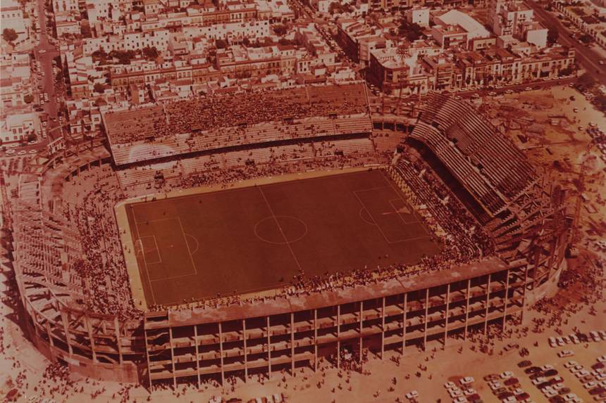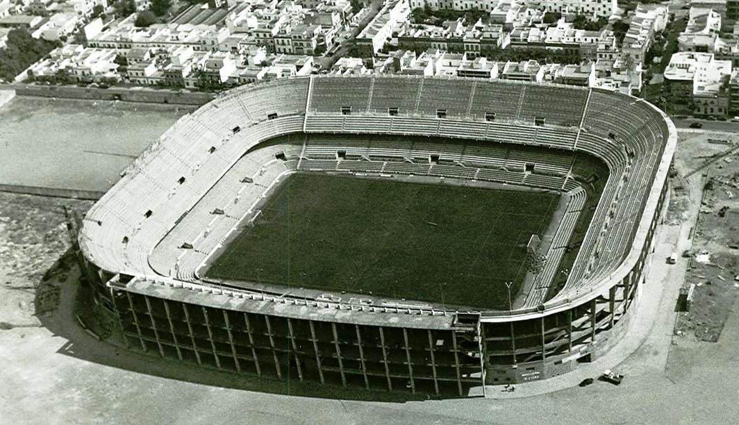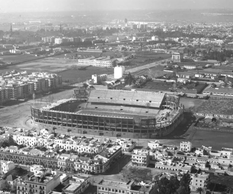 The forward-thinking Ramón Sánchez Pizjuán had been club president since 1932 and had overseen the club’s 1945-46 La Liga title and 3 wins in the Copa. He recognised that the club would require a larger stadium if they were going to compete and sent a fact-finding delegation to Real Madrid to quiz them about their new stadium. By the mid-1950s the club had amassed a 50 million peseta war chest, specifically set aside for the building of a stadium on the land purchased nearly 20 years earlier. Designed by Manuel Muñoz Monasterio, who had collaborated on the Nuevo Chamartin, work was underway when on 28 October 1956, the club was rocked by the sudden death of president Ramón Sánchez Pizjuán. Work continued, but progress was hampered by the quality of the subsoil. Over 800 concrete piles had to be sunk before construction of the main body of the stadium could commence, and it soon became obvious that their war chest would only cover a third of the costs. The new stadium opened on 7 September 1958 with a friendly against Real Jaén. Two weeks later, Sevilla played Betis in the first league match at the stadium, which Betis won by 4 goals to two.