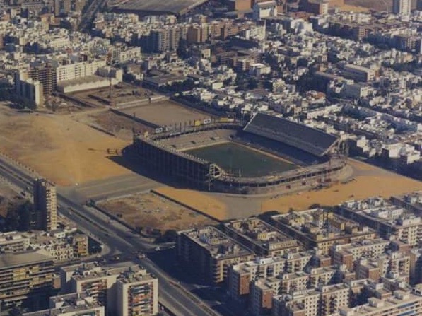 The next major change to the stadium came in the build-up to the 1982 World Cup. The main addition was the erection of a roof over the Tribuna. Whilst simple in design, it is also stunningly elegant, balanced on stilts high above the upper tier of seating. A retaining wall had to be built to support the cantilevered roof and it is on the centre portion of this wall, above the main entrance, that an eye-catching Mosaic stands. Created by local artist and Sevillista, Santiago del Campo, it depicts the club crest and the shields of 60 other clubs who have visited the stadium. New floodlights were also added, but instead of towers, they sit on gantries around the top of the bowl and along the fascia of the roof. The addition of extra seats and improved media facilities saw the capacity drop to 66,000. Surprisingly, the stadium only hosted two matches at WC’82, the first round clash between Brazil & USSR and the memorable semi-final between Germany & France. Four years later, the instantly forgettable European Cup Final between Barcelona & Steaua Bucharest was played at the stadium.