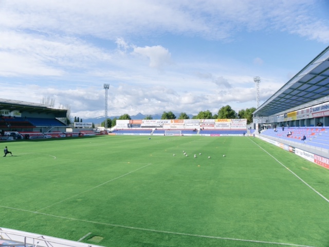 There was talk about SD Huesca moving to a new ground, with a site next to their old Campo de San Jorge being discussed. However, in the end, the focus turned to redeveloping El Alcoraz. In 2011, the Grada Lateral was built. Sitting opposite the main stand, it consisted of eight rows of blue seats with the club’s name picked out in red. It has a straightforward, if somewhat high, cantilevered roof, which did not offer much in the way of cover, but plenty in the way of advertising space. Plans to redevelop the areas behind each goal were shelved following a two-season stay in Segunda B in 2013. SD Huesca’s return to La Segunda and subsequent promotion to the top tier led to further change. By 2021, both the Fondo Norte & Sur had been extended and featured cantilevered roofs. The Grada Lateral also saw an extension, with an additional six rows of seating and private hospitality at the rear. Finally, New floodlights and larger media facilities were added, whilst access to the stadium was also improved.