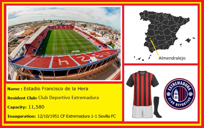 The Estadio Francisco de la Hera is not the first football ground in the town, that was the Campo de Santa Aurora which was on Camino Alange. This was used from 1928 to 1935 when they moved the short distance to Campo Santa Elvira. In 1950, the idea of building a municipal stadium was formed. They moved to a plot of land adjacent to the proposed stadium and for just over one season played at the site called Los Cañizos. On 12 October 1951, CF Extremadura played Sevilla FC in the inaugural match at the new Estadio Francisco de la Hera. The stadium remained relatively unchanged until 1996 when following promotion to La Primera, it was rebuilt over the course of 8 weeks. Such was the speed of the project, that when the stadium was re-opened on 9 September 1996 for its first top flight match against Real Betis, the club had yet to install seats.