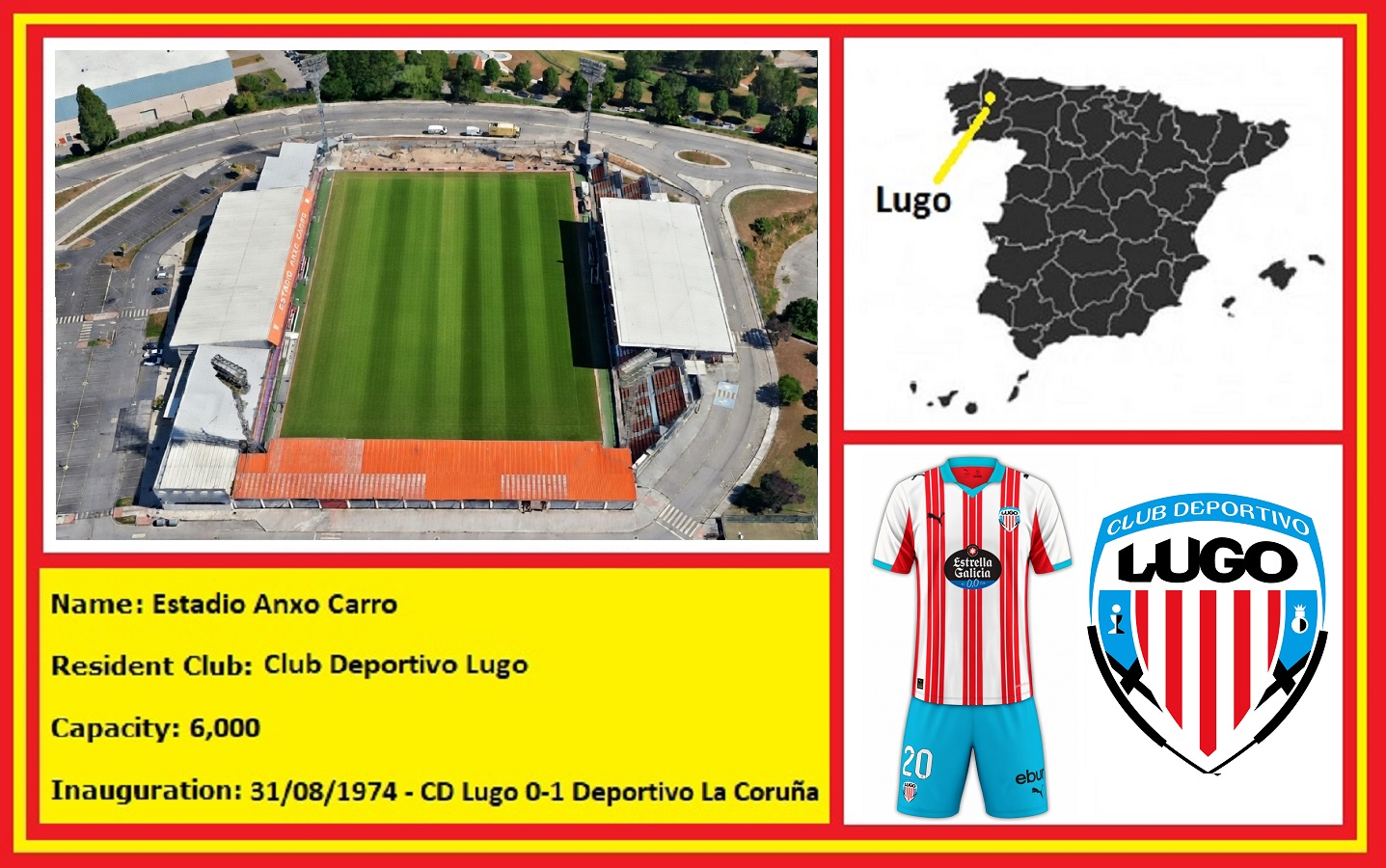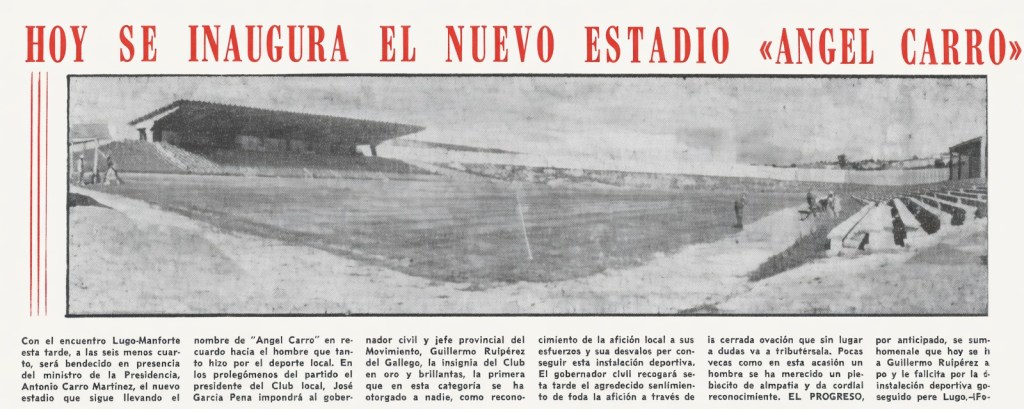 In 1973, the local council bought the land on which Los Miñones stood and built a new stadium to the west of the city, on land above the Rio Miño. The Estadio Angel Carro was inaugurated on 31 August 1974 with a triangular tournament between the hosts, Deportivo La Coruña and CD Lemos. On opening, it featured a main stand on the west side of the ground that had a low concrete cantilevered cover and was 60 metres in length. At the southern end of the ground stood a narrow terrace and the changing rooms, which were accessed from behind the goal. The whole of this end was covered in dozens of advertising hoardings. The east side was a full-length open terrace with a short cover at the rear, whilst the north end featured an open grass bank. With a capacity of 8,000, the city had a stadium that was ready for better things. Regrettably, CD Lugo was not, and they remained stuck in the Tercera for another four seasons.
