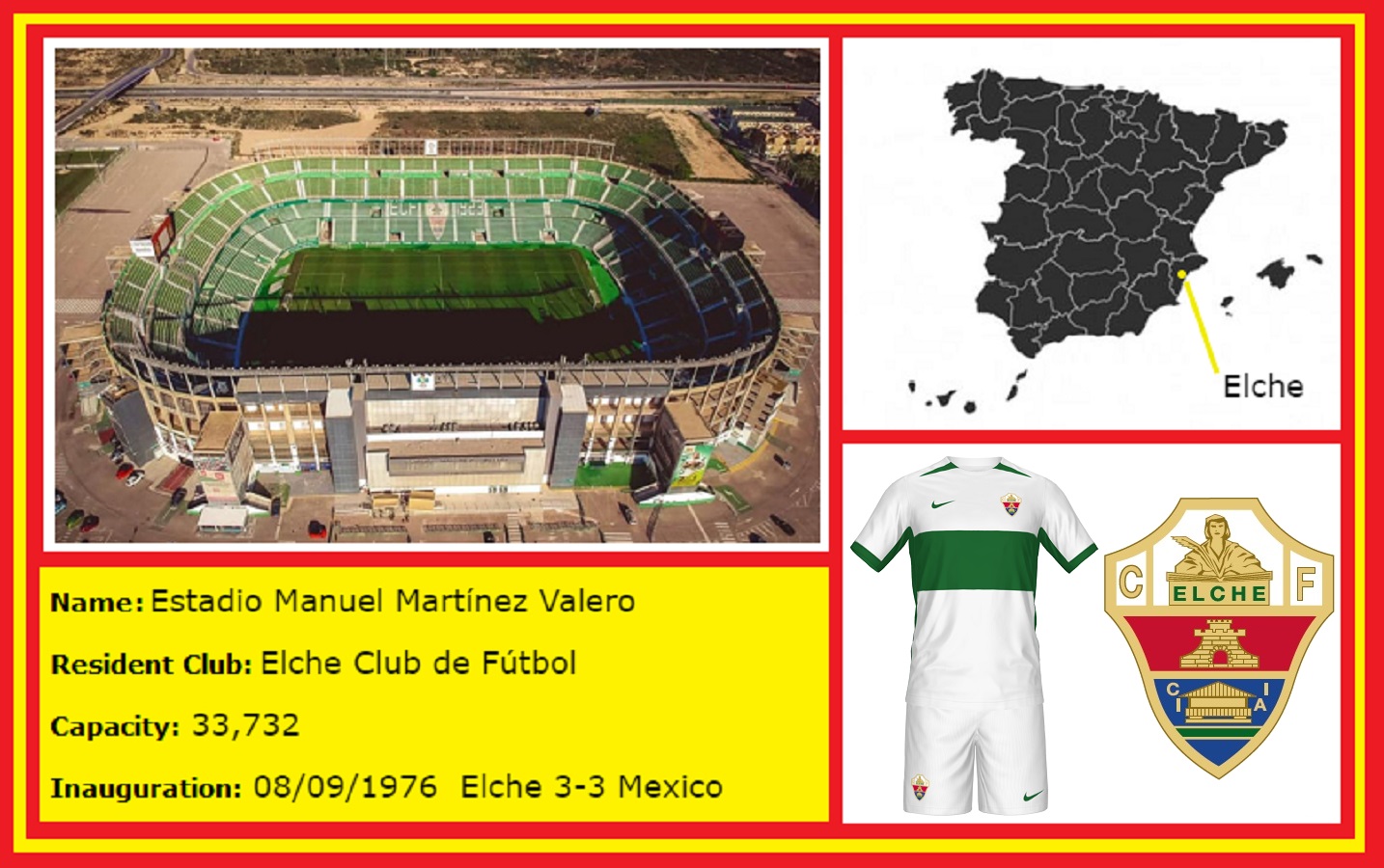 The Estadio Manuel Martinez Valero is one of those stadiums that has won me over. Aesthetically, it is just a big, rather featureless bowl that would not look out of place in the top division of any European or South American league. It also features La Liga’s biggest pitch ( 108m x 70m). The fact that it has seen very little top-flight football almost adds to its allure, as does the story of Martinez Valero’s determination to get it built in the first place. It is now decked out in dark green with the club crest & name prominently displayed on the east stand. With the stadium now fully seated, capacity has reduced to 33,388. Simon Inglis, in his book The Football Grounds of Europe, felt that a smaller stadium would have suited the club and the city better, saying that it was a case of the shoemaker getting too big for his boots! However, doing it the easy way just wasn’t Manuel Martinez Valero’s style. He walked the extra miles, and the story of Elche CF is all the better for it.