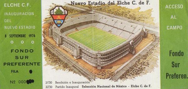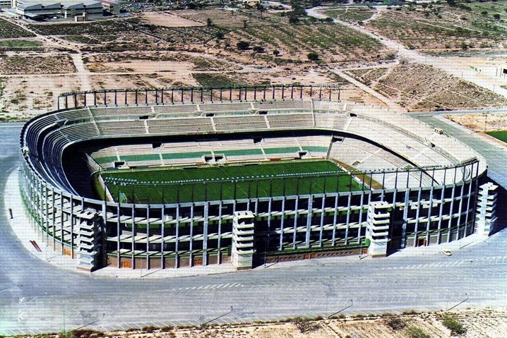 With building underway and the club back in the top flight following a brief drop into La Segunda, thoughts turned to the naming of the new stadium. “Nou Altabix” was a front-runner and “La Palmeral” or The Palms (You can’t go 20 yards without bumping into one in Elche) was also favoured. In total, 17 names were put forward and the local newspaper ran a ballot, which resulted in the rather anodyne “Nou Estadio” coming out on top. The stadium was only named after the erstwhile president posthumously in 1988. Elche’s Nou Estadio opened on 8 September 1976 with the president’s wife kicking off a friendly match against the Mexican national team. Upon opening, the stadium featured one double-decked stand on the west side, but the remaining upper tiers were unfinished. It held 28,000 and was certainly more spacious than Altabix, but it could also be argued that it had arrived at least 5 years too late. Elche CF’s peak had occurred in the late sixties, and the impressive stadium was not being matched by the form on the pitch.