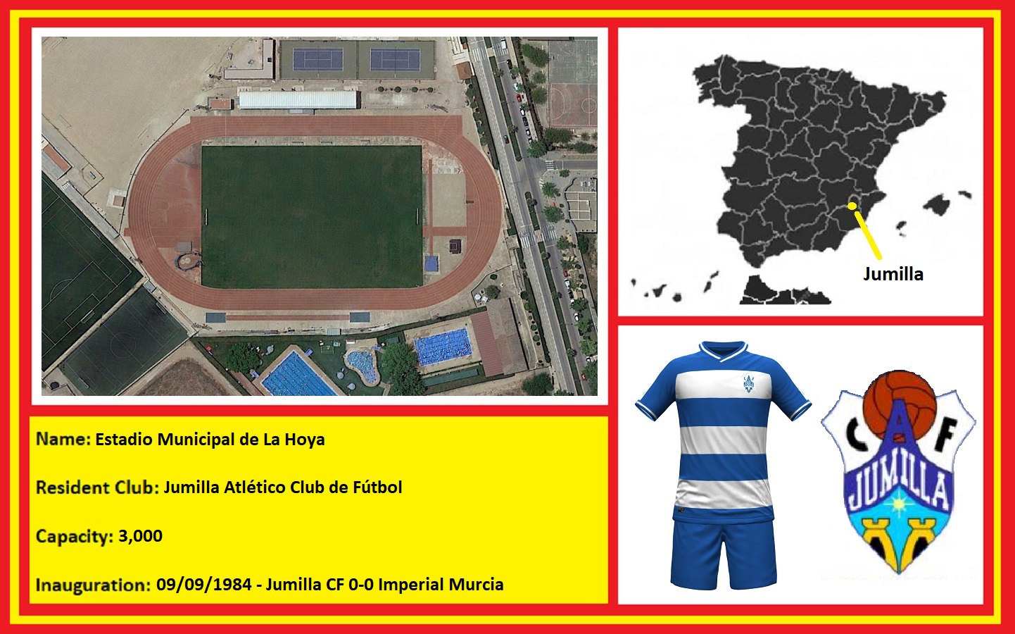 In the summer of 2011, Fútbol Club Jumilla was formed and acquired the place vacated by Moratalla CF in the Tercera. Over the next four seasons, it made steady progress, culminating in its first Tercera title in 2015 and promotion via the playoffs to Segunda B, thanks to a 5-4 aggregate win over Catalan side FC Ascó. In June 2016, the club was acquired by two Chinese commentators, Li Xiang and Tang Hui, and Argentinian Rubén Iglesias. In November of 2016, the league match with another Chinese-owned club, Lorca CF, was broadcast live over the internet in China. After three mid-table finishes in Segunda B, FC Jumilla surprisingly appeared on the radar of English Premier League club Wolverhampton Wanderers. In 2018, the clubs entered into a partnership that saw Wolves loan a number of their younger players to Jumilla. The 2018-19 season ended in relegation, following a play-off defeat to Real Unión. With debts outstanding of €400,000, the club was demoted a further level and was wound up in August 2019. La Hoya is now home to Jumilla Atlético Club de Fútbol, who play in Group 2 of the Primera Autonómica de la Región de Murcia (7th Tier).
