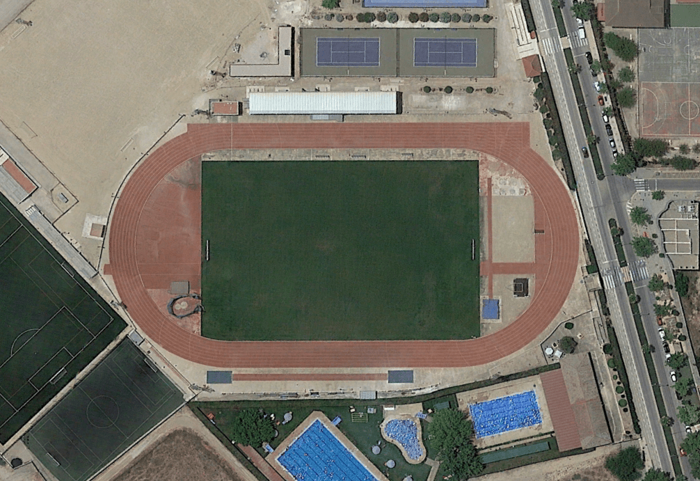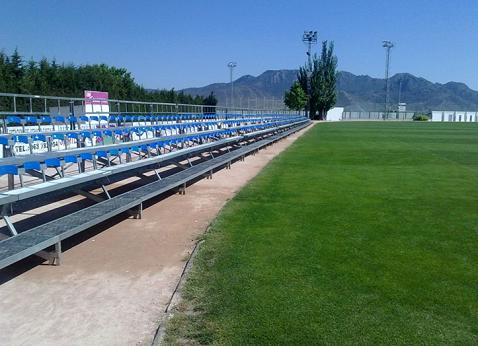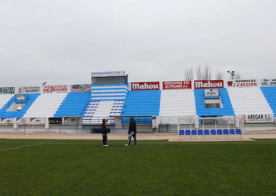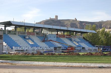 The Estadio Municipal de La Hoya is located within the Polideportivo La Hoya, which stands on the southern edge of the city. Featuring a multitude of facilities, such as swimming pools, tennis courts, and basketball courts, it is reminiscent of hundreds of other similar sports facilities that you can find across Spain. All excellent and underlining the importance that even the smallest towns place on the polideportivo. However, like the majority of stadiums you will find within these facilities, the Estadio La Hoya does not set the pulse racing. The one structure of merit is the covered stand on the west side, which has a capacity of around 1,200, spread over eleven bands of blue and white steps. At the rear centre of the stand is a media booth, bedecked in the blue and white hoops of the resident club. Hard-standing areas in front and to the side of the stand raise La Hoya’s capacity to 3,000.