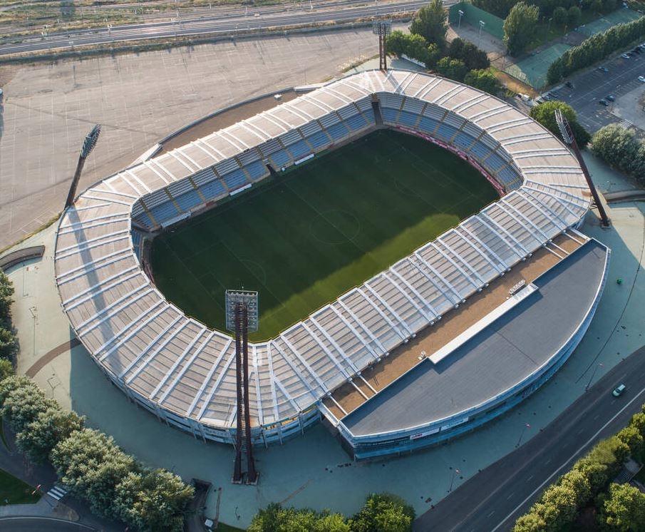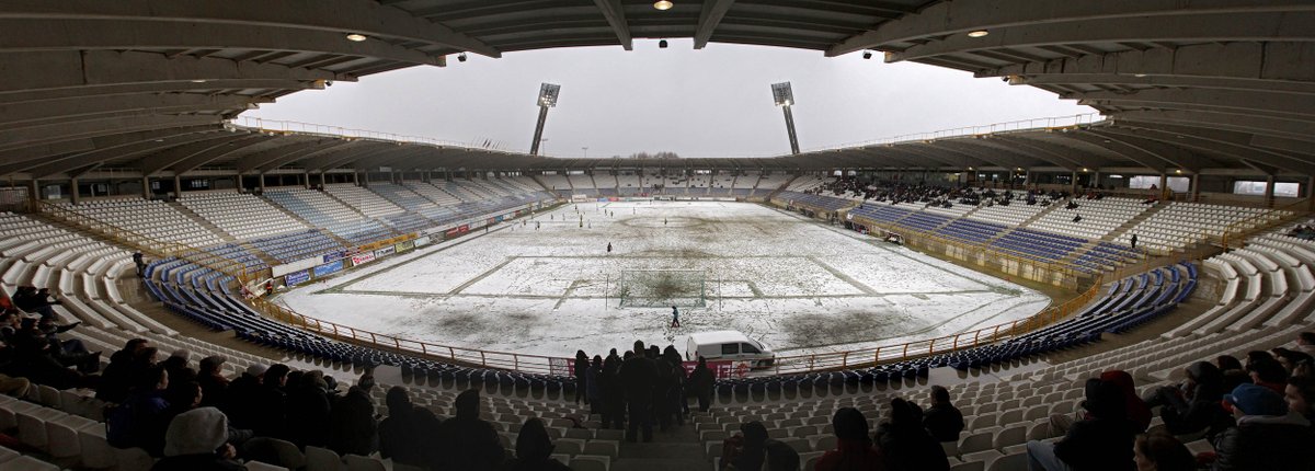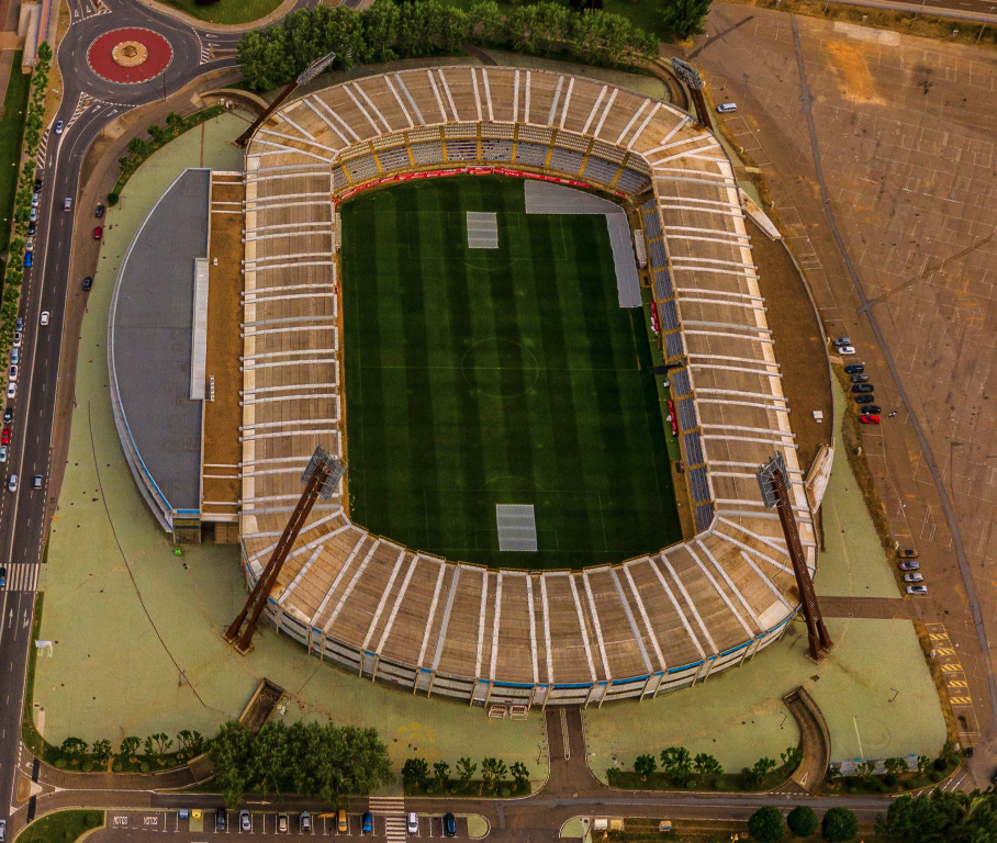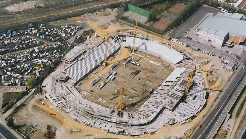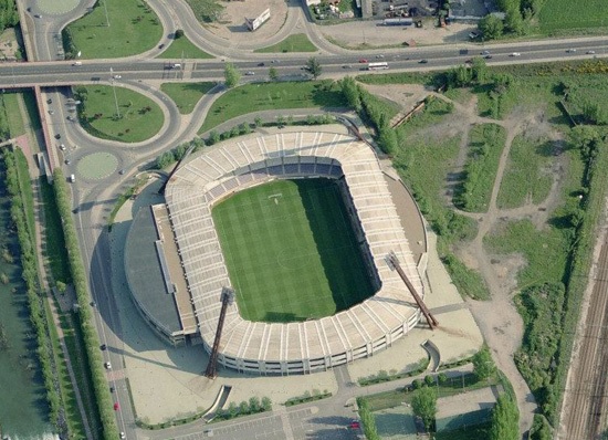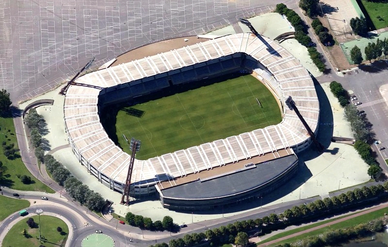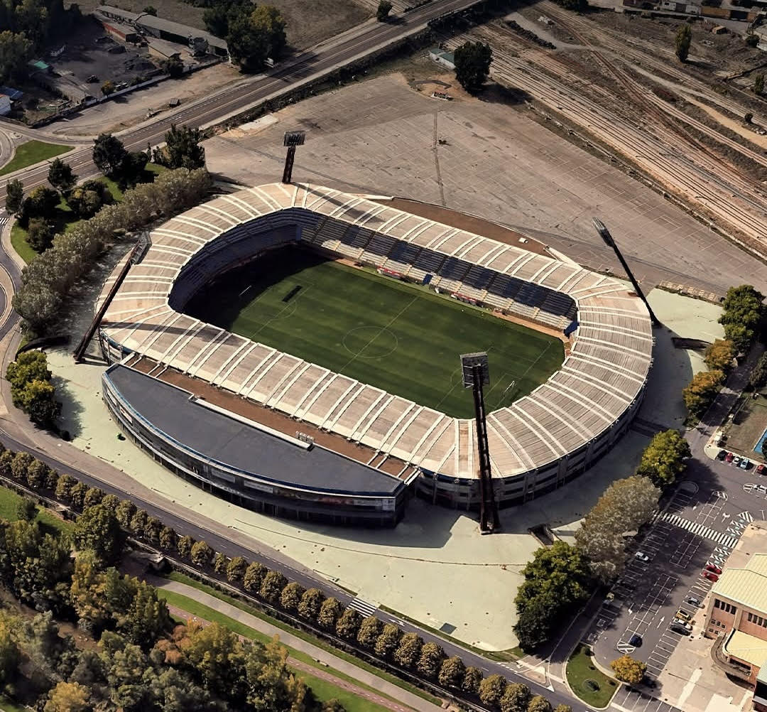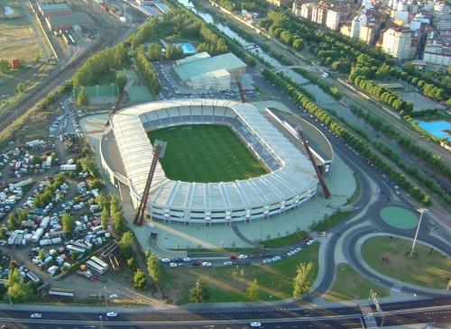 Leaning over the roof are four oversized floodlights. The stadium presents a similar problem to those experienced at the Estadio Vero Boquete de San Lázaro in Santiago de Compostela, in that the oval shape and relatively low roof mean that the lights need to lean into the arena. Rather than go for the crane style favoured by Compostela, they have chosen a design that would not look out of place in the vast concrete bowls that once graced stadiums in the Eastern Bloc in the 1970s. The structure also contains considerable office space and as you would expect from a new municipal stadium, a small indoor arena that hosts the city’s basketball & handball clubs. The stadium also stages the ubiquitous summer concerts, but sadly, it has not hosted the Kings of Leon.