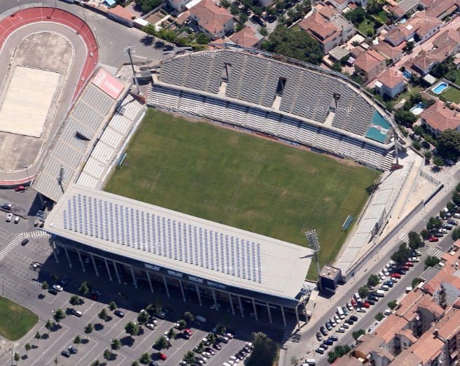 After all those fiscal fiascos that dogged the history of UE Lleida, it’s a relief to talk about the stadium, and I have to say that I like the Camp d’Esports. Built in haste, it could easily have become a prefabricated non-entity. Brufau’s design, however, is lively and distinctive. The west, north and east sides feature double-decked seated stands, but it is the roof on the west stand that lifts this re-build above the ordinary. This structure stands high over the upper deck, but rather than being supported by cantilevered struts along the back of the stand, two huge supports pierce through the upper seating deck and hold the roof aloft like a champion weightlifter. To accommodate this unusual design, the upper level has two large voids cut into the deck. The opposite east side features a sculpted anfiteatro, which also features large voids-come-vomitories. However, these are for effect rather than functionality, but along with the curve, add to the stand’s pleasing proportions. The north end also features a twin-decked stand, the upper tier of which hangs over part of the city’s velodrome. The southern end is a single tier of seating, which is a continuation of the lower ring of seating.