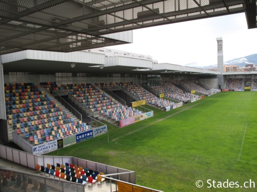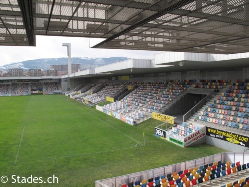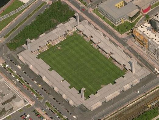 The seating is made up of a series of brightly coloured seats, which give the appearance of full occupancy, even when the stadium is empty. The players & officials changing facilities are accessed via a ramp in the south-west corner, whilst the north-west corner has a similar arrangement for the groundsman’s equipment. Club offices are also contained within this block. Instead of being a separate entity, the floodlight towers rise out of the body of the stadium. Rather than pointing towards the pitch, these towers are at right angles to the playing surface, however, their lighting gantries are angled to ensure illumination. The coup de grace, however, is provided by the stadium’s exterior which is made up of a series of turrets, which undulate around the stadium, like a cubist wave. It’s all very daring for a stadium, yet in keeping with the new wave of urban architecture that has exploded across the city of Bilbao in the past decade.