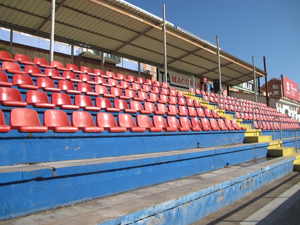 Pinilla features a simple main stand with a propped cover on the west side of the ground. This cover dates from the club’s promotion to Segunda B in 1987. It is around 35 metres long and features four broad bands of red & blue seats, on either side of a narrow central seated area for club officials. To the left of the stand is a short, uncovered terrace. Opposite is the main open terrace. This runs the length of the pitch, but narrows towards the southern end to accommodate club offices. A narrow, barely functional cover stands at the back of the terrace. In the summer of 2016, seats were installed on the terrace, which had been donated to the club by Levante UD. There is an area of hard standing behind the north goal, which occasionally has temporary seating, whilst the space behind the south goal is turfed. Pinilla is one of those stadiums that is well-suited to life in the Tercera, but starts to look a little archaic when placed against the modern builds that sprang up over Spain in the last decade or so.