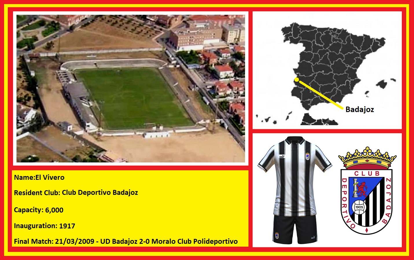 In 1910, the club joined the Spanish football federation and incorporated the city into its new name, Badajoz Sporting Club. There was another change in 1915, when the club merged with Comercial Foot-ball Club to form Sport Club Badajoz. The club adopted the now familiar black & white striped shirts and switched to playing at the home of Commercial FC, the Campo de Santa Marina. The Campo de Santa Marina was owned by Demetrio Medina, the former owner of Commercial FC, and following a series of disagreements, he left the board, evicting Sport Club Badajoz in the process. Thankfully, Francisco Fernandez Marquesta, the Conde de la Torre del Fresno, came to the rescue and rented a patch of land to the club back across the Rio Guadiana at El Vivero, which would remain the club’s home for the next 81 years. El Vivero was initially enclosed with a simple barbed wire fence, but upon joining the new Federación Regional Extremeña in 1924, the ground was properly enclosed, proper entrance gates were built, and dressing rooms, which resembled a small chapel, were built in the southeast corner. Francisco Fernandez Marquesta passed away in 1931, and ownership of El Vivero switched to the club. That year also saw Sport Club Badajoz join the Federación Oeste, with the clubs such as Recreativo Huelva, CP Cacereño and a new club, Racing Club Badajoz. Racing would suffer the disappointment of a playoff defeat to Racing Club de Córdoba in February 1936, and a month later, it was absorbed into Sport Club Badajoz under the new name of Badajoz Foot-ball Club.
