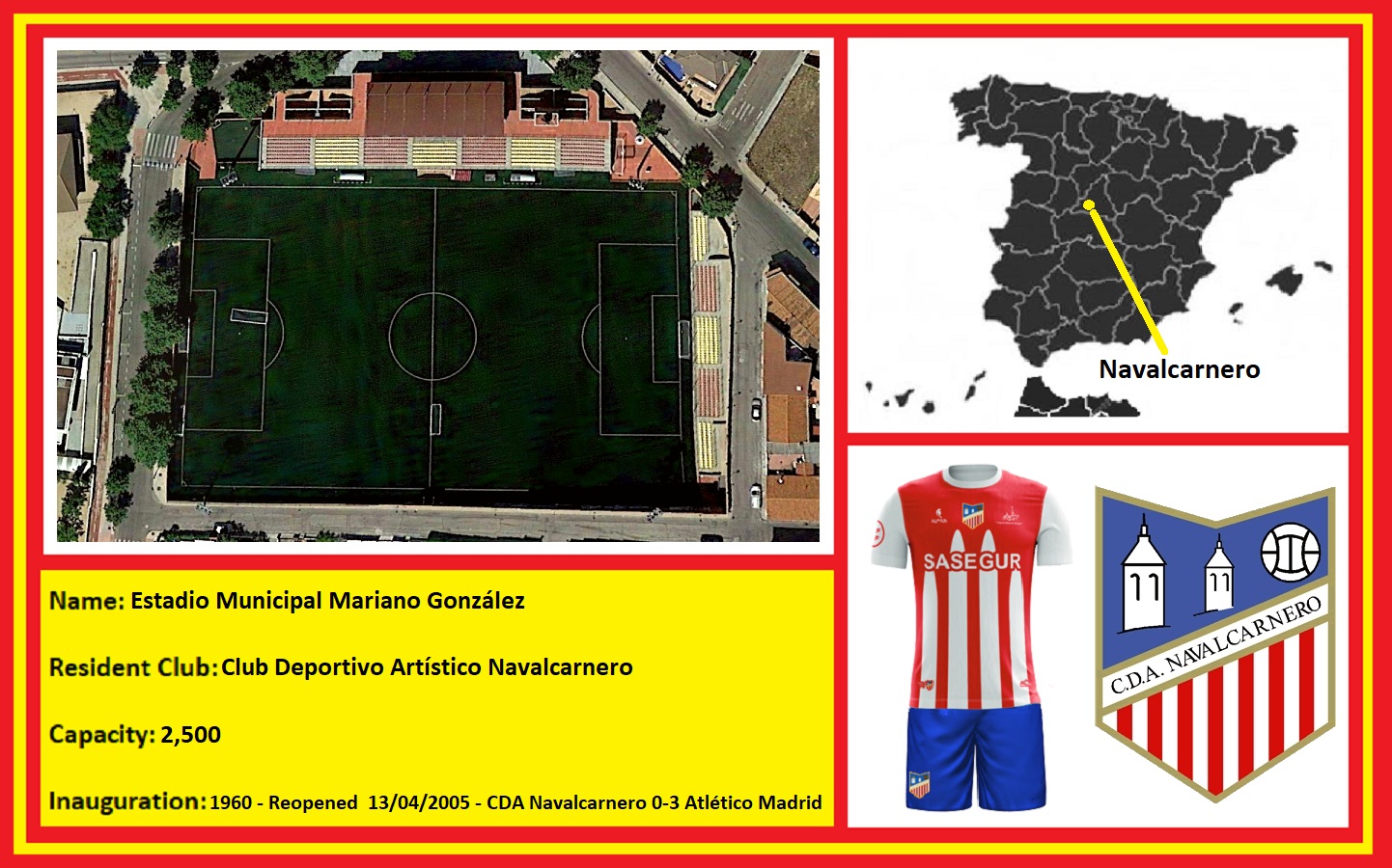 Navalcarnero is a small town, 30 kilometres southwest of Madrid. Nothing remarkable in that, but for a stadium aficionado (AKA geek), it has something rather special tucked away in its southern suburbs. But before we get too excited, too soon, let me tell you about the town’s resident club, the rather grandiosely named Club Deportivo Artístico Navalcarnero.