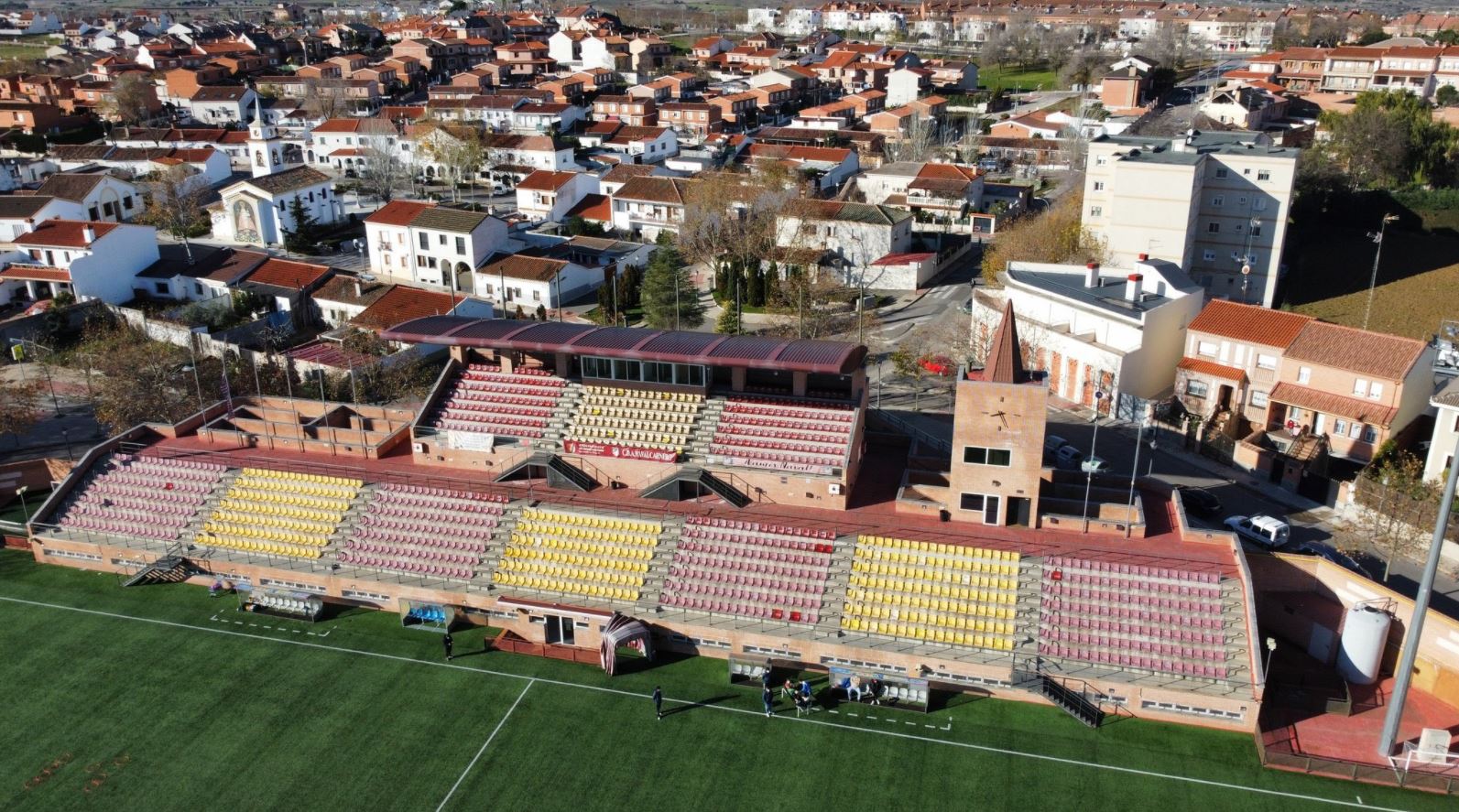 But it is the main stand that really sets this ground apart. Bedecked in burgundy and yellow seats, the colours of the town, it is a two-tiered structure, with a lower bank of seats that runs between each penalty area. The second tier is only 30 metres in length and is covered by a burgundy cantilevered roof. To the right of the upper tier is a tower that features the stadium control centre, a clock, and, to cap it all, a 4-metre spire (in burgundy, of course!). The municipality really does deserve congratulations, as it would have been so simple to build a faceless stadium that ticked all the boxes. Instead, they have built a stylish and distinctive stadium that sets Navalcarnero apart from so many other new builds in Spain. The excellent The Team On Tour paid a visit to the Estadio Municipal Mariano González in August 2018. You can watch their video here.