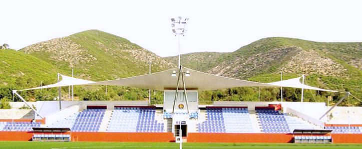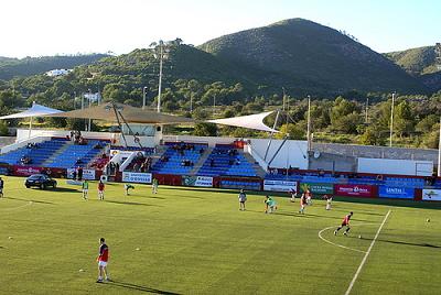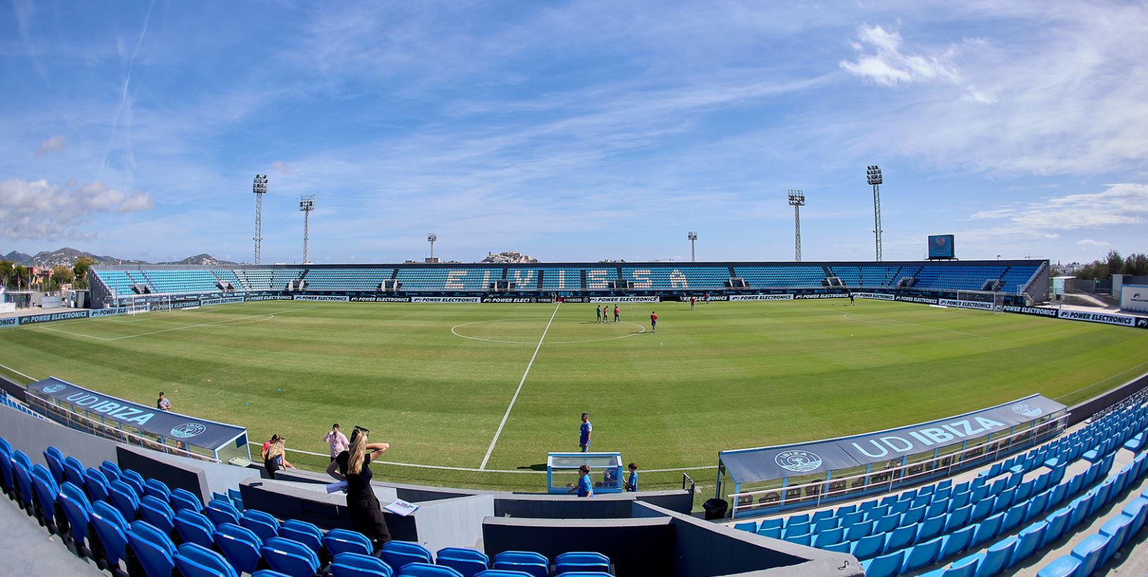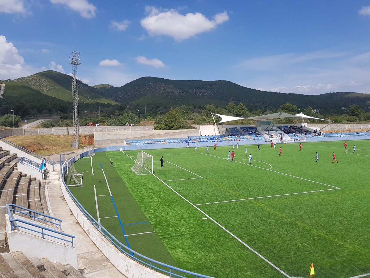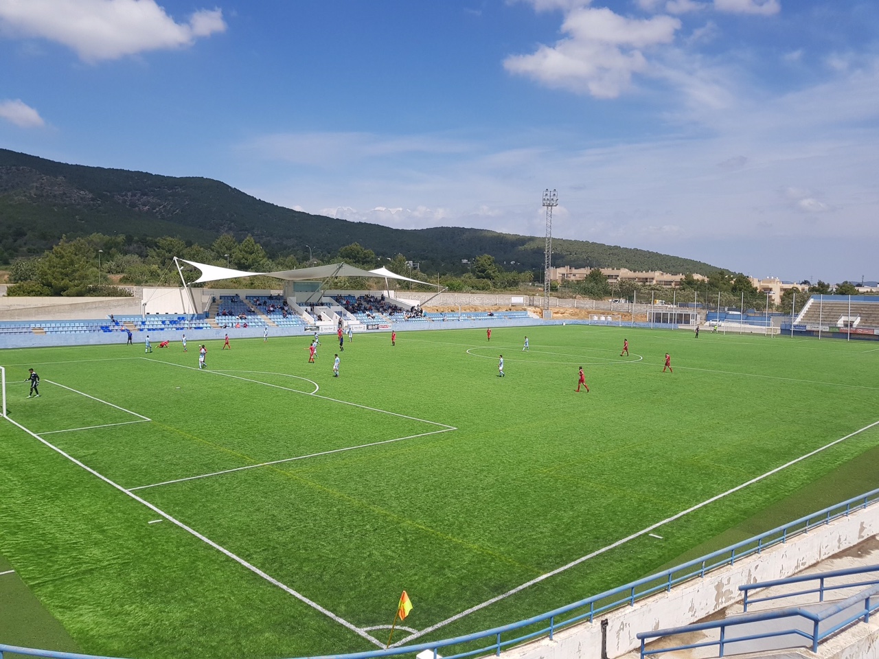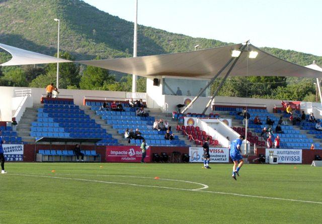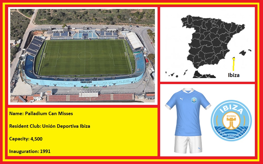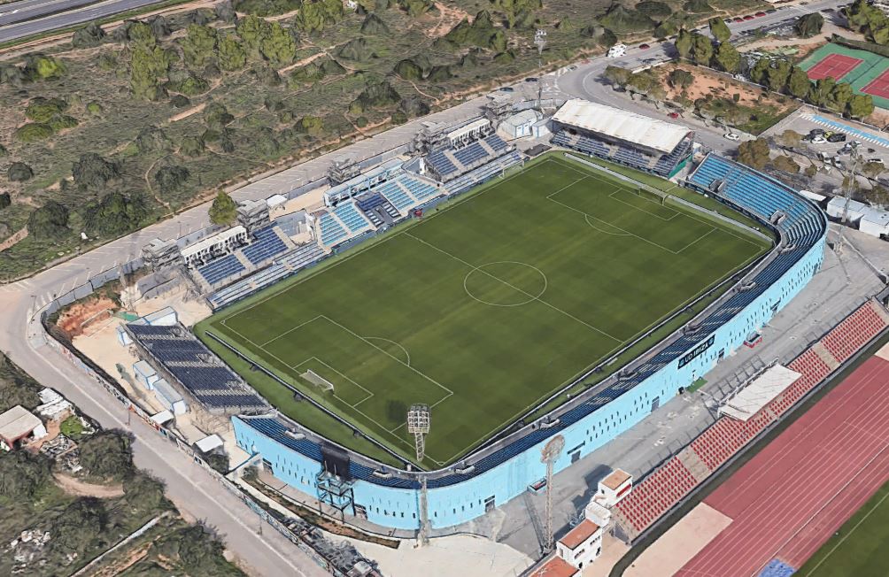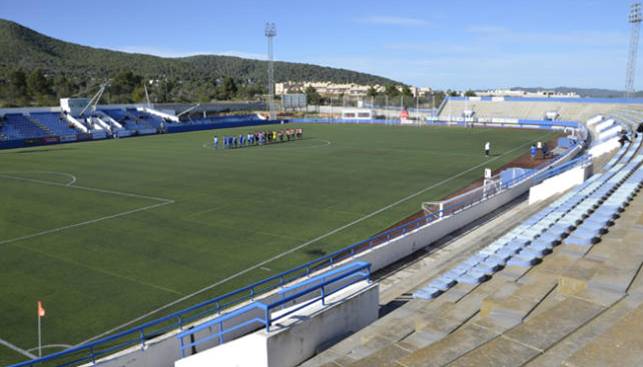 In 1991, the municipality opened the Estadi Can Misses to the west of the town, which was three parts impressive, one part barren wasteland. On opening, Can Misses was a horseshoe-shaped enclosure with a capacity of 9,000 across three open terraces. The third side was left open. During the summer of 2002, the municipality refurbished Can Misses, by upgrading the artificial pitch and building a single tier stand on the west side that included changing & media facilities. The bank of blue & yellow seats tapered away to the north and south sides, whilst the central section was covered by a canvas sail-like cover. Unfortunately, it was a case of style over substance. In November 2012, high winds damaged the cover and it was not replaced until the start of the 2013-14 season.