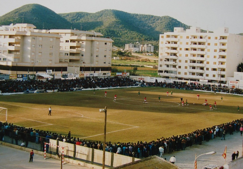 The first stadium that SD Ibiza used was the Campo de Municipal Deportes, which stood between the Carrer Balears & Carrer Canarias in the district of Sa Bodega. It consisted of two open terraces on the east and west sides and narrower terraces at the northern and southern ends. Changing facilities were housed at the southern end, next to tennis courts, which still stand next to the Parc de la Pau, which now covers the site of the former football ground.