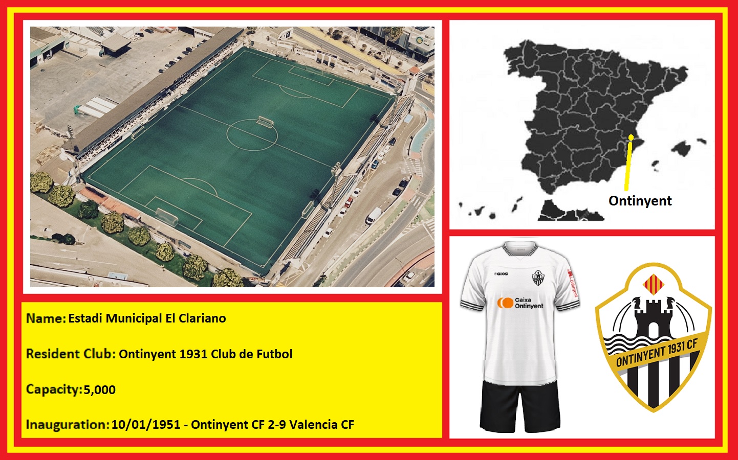 Following the demise of Ontinyent Club de Futbol in 2019, its successor, Ontinyent 1931 Club de Futbol, assumed the role of representing the city and made El Clariano its home. Starting in the seventh tier of the Spanish football pyramid, it reached the Tercera Federación (Tier Five) in 2023.