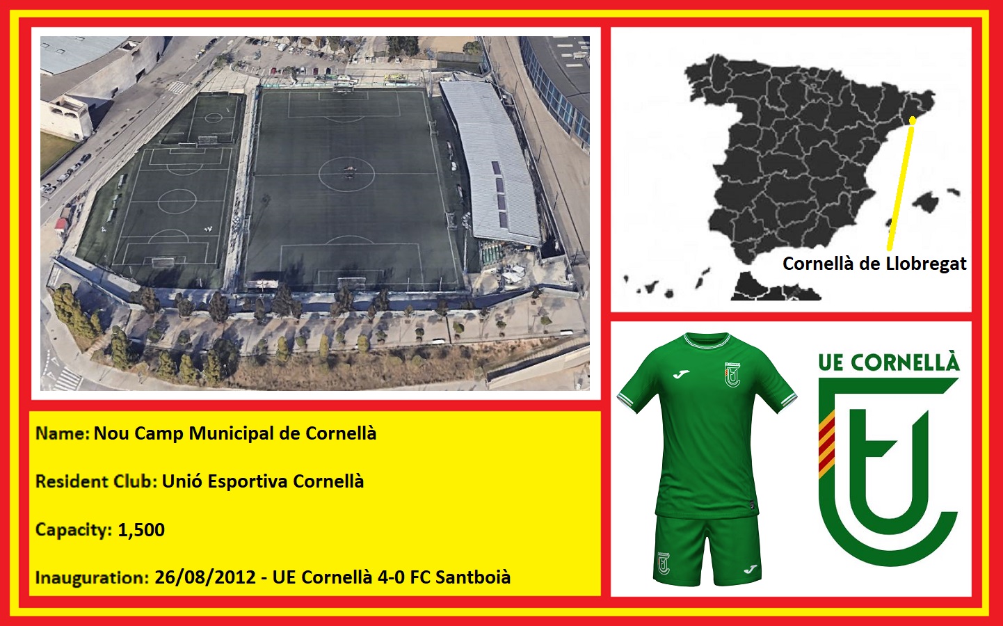 Following promotion to Segunda B in 2014, UE Cornellà recorded six top-ten finishes in the seven seasons up to the restructuring of the Spanish football pyramid. This included three successive fourth-place finishes, which earned the club a place in the end-of-season playoffs for promotion to La Segunda. Unfortunately, defeats to Sporting Gijón B (2017-18), SD Ponferradina (2018-19), and CD Castellón (2019-20) ended those hopes. However, in the delayed and restructured 2020-21 season, UE Cornellà’s fifth-place finish and subsequent topping of the playoff group earned a place in the new third-tier, the Primera Federación. There was a problem, as their ground did not meet the required standard for capacity and quality of floodlights, and artificial surfaces were outlawed. A deal was struck with their bigger neighbour, which saw UE Cornellà play at the RCDE Stadium for the 2021-22 season. After two seasons with the neighbours, UE Cornellà moved out, playing matches at the Estadi Palamós Costa Brava, and Espanyol’s training ground, the Ciutat Esportiva Dani Jarque. After effectively playing all their matches away from “home”, it came as no surprise when the club was relegated to the Segunda Federación in May 2024. UE Cornellà returned home to the Nou Camp Municipal de Cornellá for the start of the 2024-25 season, but could not prevent a further relegation to the Tercera Federación in May 2025.