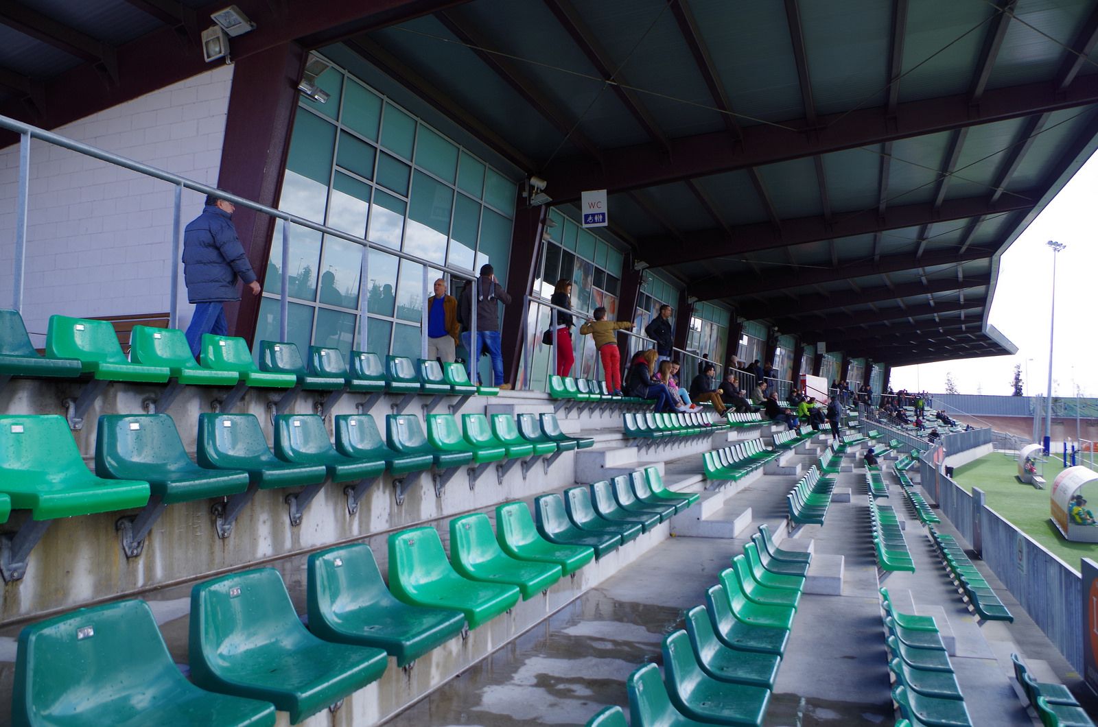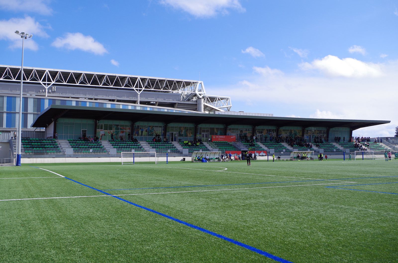 On 26 August 2012, UE Cornellà hosted FC Santboià in the first official match at the Nou Camp Municipal. Midfielder Luis had the honour of scoring the first goal at the new stadium, as the hosts romped to a 4-0 victory. The new stadium was built for €7m and stands less than 20m from the western edge of Espanyol’s RCDE Stadium. It is a single-stand enclosure, with the only tribuna seating 1500 over six rows of green seats on the eastern side. The cover is just over 80 metres long and features a propped cantilevered roof, with the space behind the props housing offices, bars & catering facilities. This ensures that all the seating and the rear balcony have an unimpeded view of the playing area. A new generation artificial surface has been installed (a de rigueur requirement for the majority of new small stadium builds) along with 2 Fútbol 7 pitches along the western edge of the enclosure. All very practical, tidy and financially sensible, but it doesn’t get the pulse racing like its sexier and more buxom neighbour. However, there is a sense of home, emphasised by the fact that the new stadium practically overlaps the site of the old Estadi Les Aigües, the home of one of their ancestors, Athletic Cornellà Foot-ball Club.