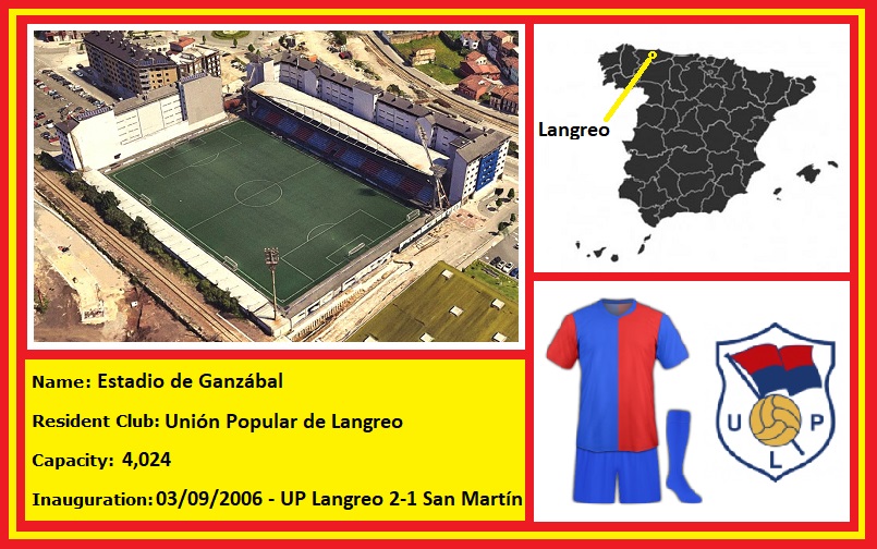 The Estadio Ganzábal was developed by the municipality during the sixties when an 80 metre seated stand was added to the east side. The old west cover was replaced with a new concrete cover in the mid-1970s, which was only 50 metres in length but did hang over a new seated area. UP Langreo did return to a nationwide second division in 1970, but this excursion lasted just two seasons and the club has yet to scale such heights again. It did make the newly formed Segunda B in 1977 and played at that level in 14 of the next 22 seasons. They reached the play-offs for La Segunda on just the one occasion in 1993-94. After a promising start, UP Langreo topped the group with two matches to play, but back-to-back defeats to CF Extremadura ended the dream of a return to the second tier. At the turn of the 21st century, UP Langreo found themselves back in the Tercera, and they would spend 17 of the next 19 seasons there. The only exceptions being two season-long excursions back in Segunda B in 2002-03 & 2014-15. At the end of the 2018-19 season, UP Langreo returned to Segunda B, and following the restructuring of the Spanish football pyramid in 2021, play in Segunda Federación.