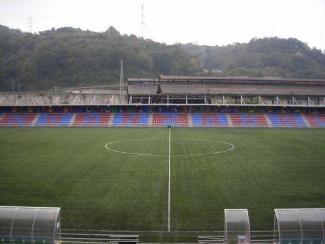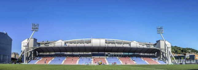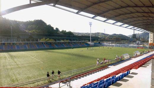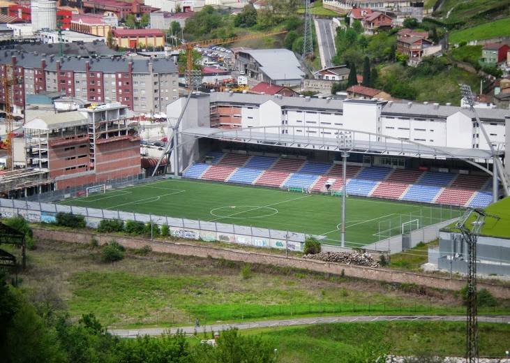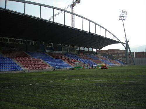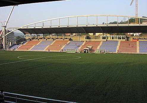 The town of Langreo has had to reinvent itself in the early 2000s, after the closure of the mines and foundries in the late twentieth century left the town in the doldrums. Part of its urban regeneration saw the area around the ageing Estadio Ganzábal turned into a new sports centre in 2005. A year later and the stadium itself was completely rebuilt, and what a mighty fine job the municipality has done. The centerpiece is a full length, single tiered stand on the eastern side of the stadium. Whilst broad bands of red & blue seats add colour to the structure, it is the curved cantilevered roof that catches the eye. Suspended from above by a giant steel arch, it is a modern take on a classic design that now stands 180 miles along the coast at Athletic Club’s Lezama training complex. The arch is tethered at each end, and from these anchor points, sprout two floodlight pylons that lean dramatically towards the pitch. Opposite the main stand is the altogether more conventional west stand, which features a narrow cantilevered cover above red & blue seats that spell out the club’s name. The rebuilt stadium has a capacity of 4,024. The first official match at the reconfigured stadium was played on 3 September 2006, when UP Langreo won 2-1 vs CD San Martín. On 20 September 2006, Spain & Turkey met in an Under-19 international at the stadium. Asturian Juan Mata had the honour of scoring the first goal. The project was completed in 2008, with the installation of an artificial surface.