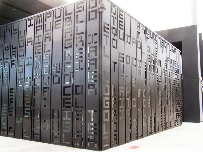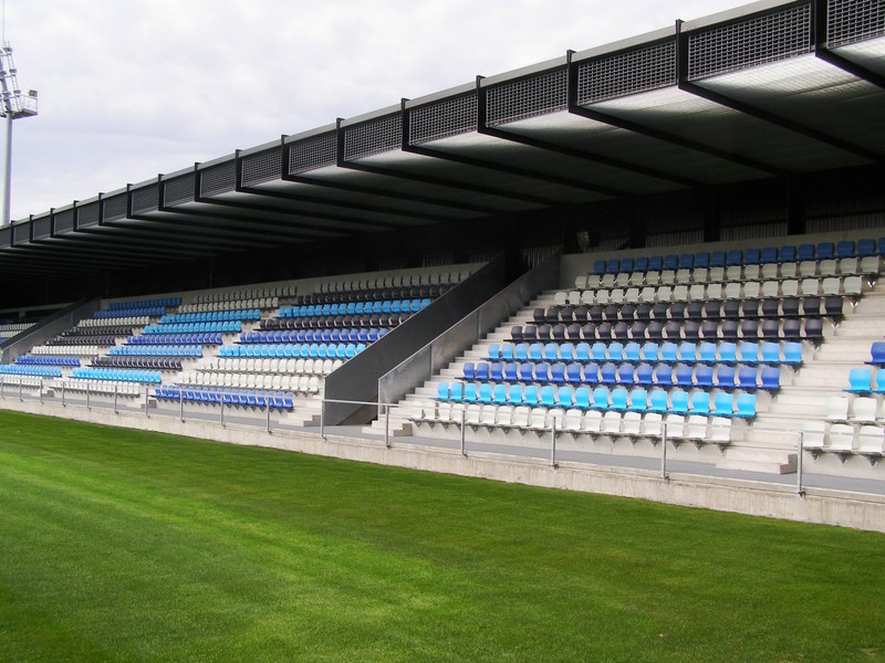 Despite the delays and budgetary issues, the Municipality of Torrelavega and Gimnástica have ended up with a fantastic little stadium. It would have been very easy to construct an identikit football ground with all the same facilities, but no character. As always, it is the little touches that lift it above the ordinary. The matte black steel supports and translucent roof panels create a great juxtaposition of light and dark. An imaginative use of blue, white, and black seats, arranged in horizontal bands, ensures that the interior of the stadium creates an instant visual impact. Best of all, however, is the exterior of the east stand. This is clad with black steel sheets, which have been perforated with the words of the club’s anthem. Also, suspended a few metres above the walkway is a white canopy, which has the name of the stadium cut into the steel. A great and very effective touch that lifts this stadium above the ordinary. It remains to be seen if the stadium has the desired effect on Gimnástica. Whilst the stadium came in €600,000 over budget, it just shows what can be achieved with tight finances and a little imagination.