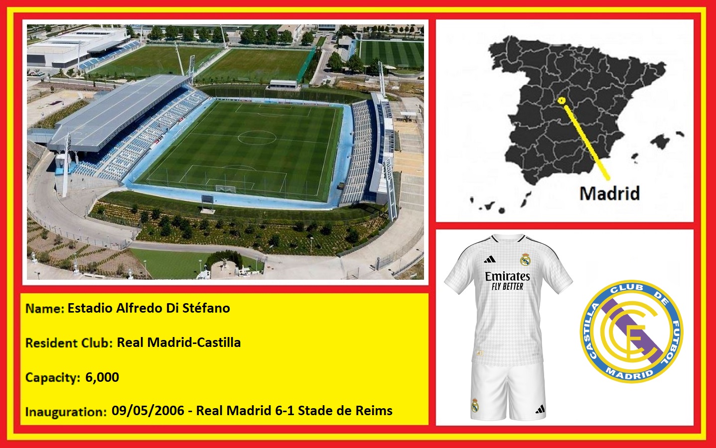 Real Madrid’s new sports city was located 6 miles northeast of the city centre, near Valdebebas. Benefiting from the 480m euros the club made from the sale of the Ciudad Deportiva, no expense was to be spared in developing the world’s largest and most lavish training complex. Real Madrid B moved in towards the end of the 2003-04 season and used one of the smaller pitches to the northeast of the complex. This had a capacity of just over 1,500 and would be home for just under two years. In July 2005, the team adopted a new title, Real Madrid Castilla and took the new name into La Segunda for the 05-06 season. On 9 May 2006, Real Madrid opened the centre-piece of their sports city, the Estadio Alfredo di Stéfano. named after possibly their greatest-ever player. In a nice touch, the inaugural match saw Real Madrid’s first team take on Stade Reims in a rematch of the first-ever European Cup Final.
