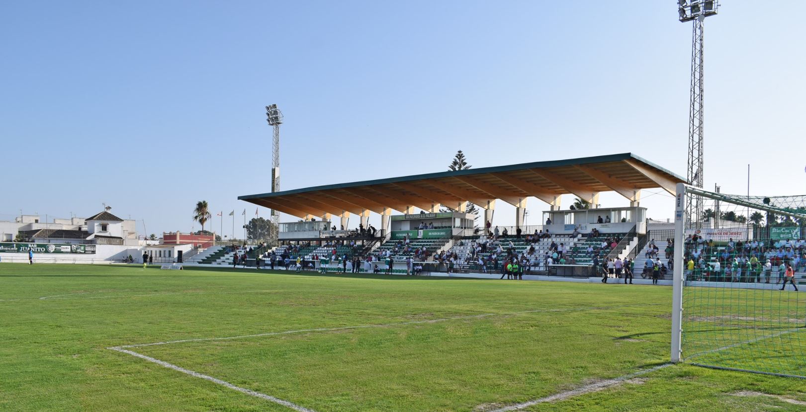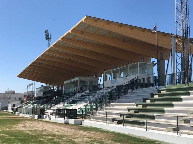 El Palmar opened in 1917 and took its name from the village of El Palmar de San Sebastián, which lay outside of the city boundary then. It was the home of Sanlúcar Foot-ball Club, which inaugurated the enclosure on 25 July 1917, beating Deportiva Chipionera by six goals to one. El Palmar has lost much of the surrounding palm groves and is now bordered by industrial outlets and mid-rise housing. That said, comparing photos from the 1950s, El Palmar has kept its basic layout. Blocks of temporary seating which are anchored to the original terracing, run down the eastern side of the ground, whilst shallower seating is found on the narrow strip of land behind the southern goal. The northern end is usually left vacant and doubles as a car park for club officials on match days, but temporary seating is often added for bigger matches. Behind the parked cars, tucked away in the northwest corner, are the club offices and changing facilities. The highlight, however, is the western side of the ground, which in the summer of 2019 gained an elegant 60-metre-long cantilevered roof that straddles the halfway line and offers much-needed protection from the sun. Rather than opt for a steel or concrete cantilevered structure, fourteen huge wooden struts support a roof constructed of more wood and bright sheet metal.