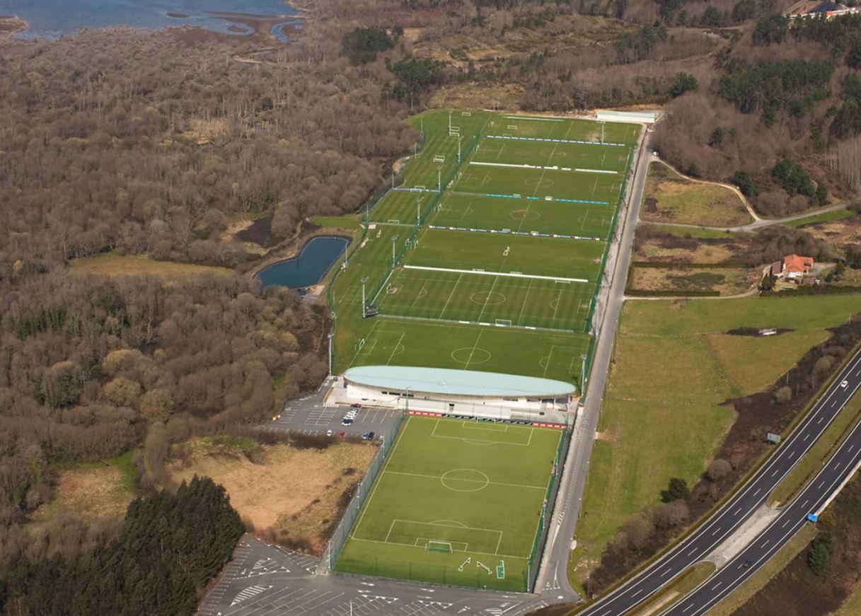 Cidade Deportiva de Abegondo is the training academy of Real Club Deportivo La Coruña. It’s situated 25 kilometres to the southeast of La Coruña, in the small municipality of Abegondo. The facility consists of 7 full-size natural pitches and one all-weather surface, all identical in size to the pitch at the Riazor. Contained within the main hub, a large, elliptical-shaped building at the southern end of the complex, are offices, changing rooms, a gymnasium, a press room, treatment/medical rooms, and a cafeteria. On the northern side of the hub is a substantial 1,000-seat stand that runs the length of the main pitch, and this is home to Deportivo Fabril. Apart from a few games at the Riazor, usually playoffs or matches against Galician rivals, this has been the team’s home since the complex opened on 1 May 2003. There is a 300-seat stand situated on the southern side of the hub, directly behind the goal of the all-weather pitch. In 2024, more parking spaces were added, and a new artificial pitch was laid 15 metres to the south. This was part of a €40 million refurbishment of the main building, which saw new gyms for the First Team and Academy, and natural turf pitches switched to hybrid turf. The refurbishment also saw upgrades to the changing rooms for the women’s team and youth academy, dining room, staff offices, leisure areas, spa facility, press room and cafeteria. This extensive project will continue with the construction of five more training pitches and a covered stand between pitches 2 and 3.