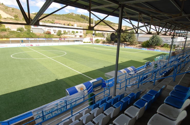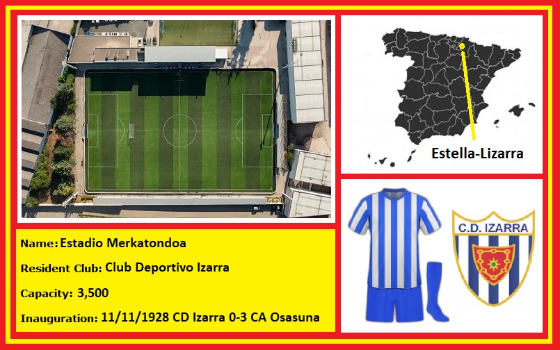 Club Deportivo Izarra hail from the western region of Navarra and the small town of Estella-Lizarra. Founded in 1924 as Izarra Beti Aurrera, it was Franco’s insistence on clubs having names of Spanish origin, that led to the club adopting its present title in 1941. Izarra’s first home was the Campo de la Pieza del Conde, but in 1928, they moved out of town and south of the Rio Ega to their present home. Merkatondoa opened on 11 November 1928 with a match against CA Osasuna.