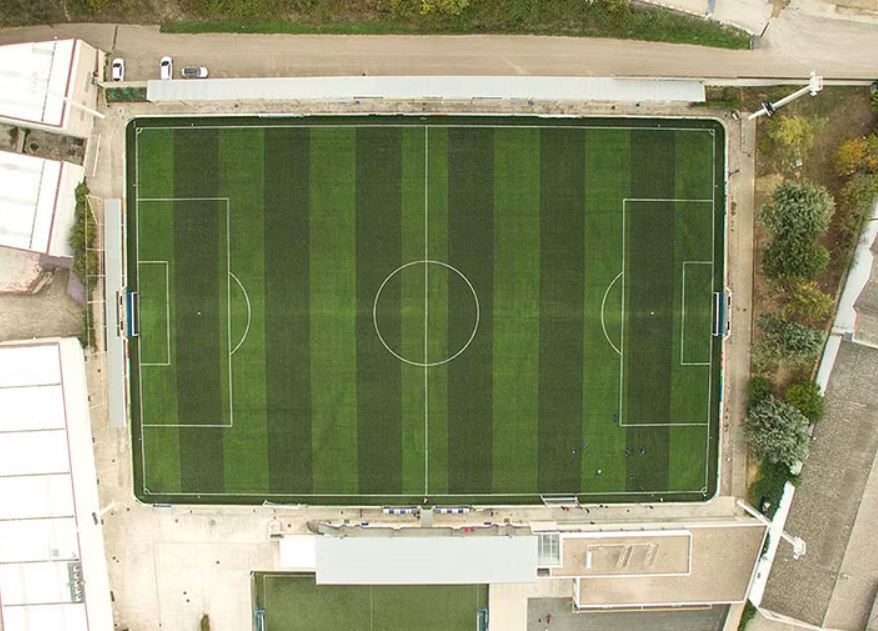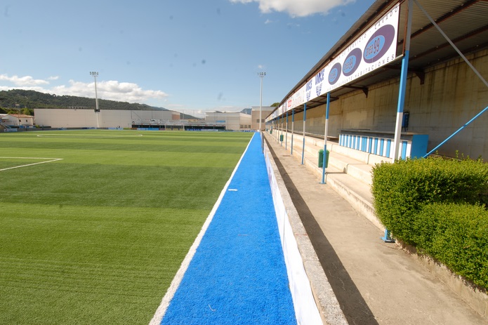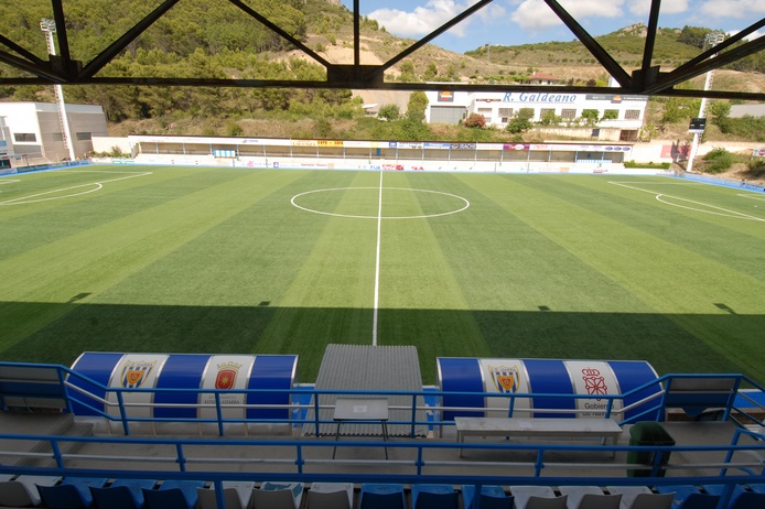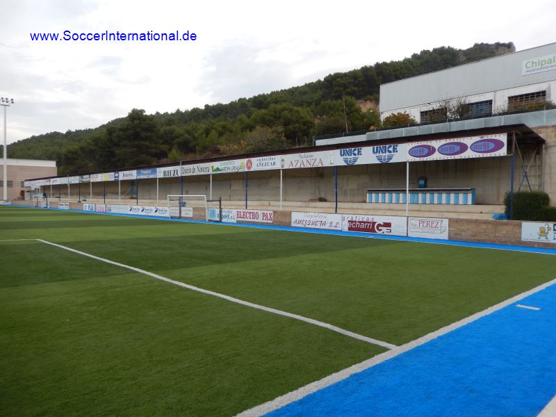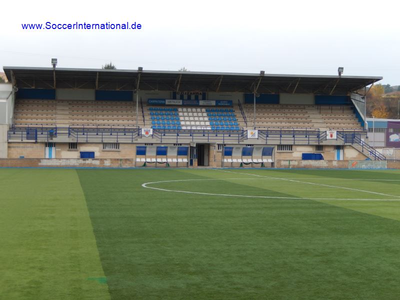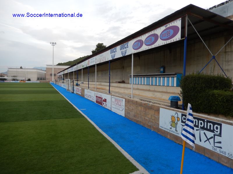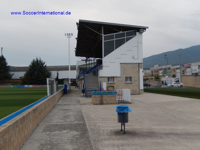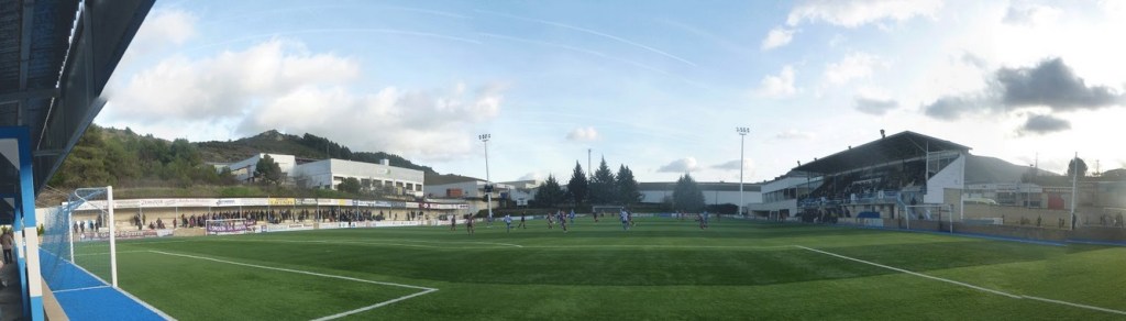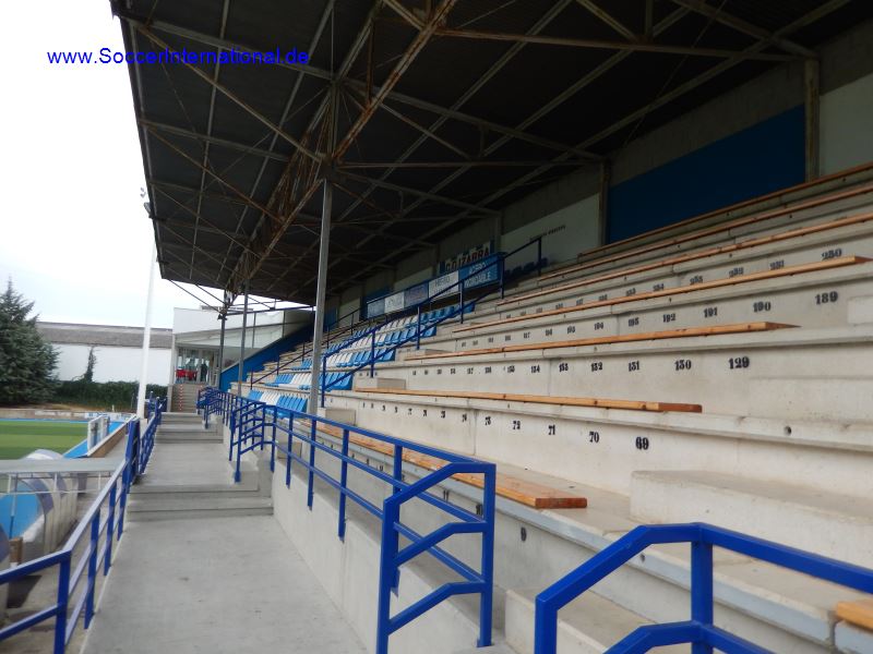 Much of what you see at Merkatondoa is as a result of building that took place in the 1987. It was smartened up at the start of the 09-10 season and an artificial surface was installed, which given that harsh winters you see in this part of Spain was a wise move. The stadium’s stand-out feature, apart from a natty blue surround to the pitch, is the main stand which has a raised seated tier with a propped cover. Just under 40 metres in length, it has 170 blue & white seats in the central section and concrete benches either side. On the opposite east side is a narrow covered terrace that runs the full length of the pitch, whilst the stadium’s only other terrace is found under a short cover on the northern side.