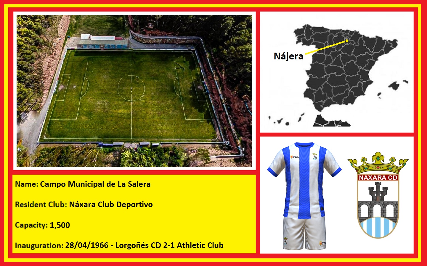 Now playing at the Campo de San Ferando, Náxara CD’s fragmented existence continued, and it wasn’t until the municipality committed to the complete refurbishment of the old La Salera site that the club returned to regular competitive action. The rejuvenated Campo La Salera was inaugurated on the 28 April 1966, with Logroñés CD and Athletic Club playing a friendly, which the Riojans won 2-1. The new layout of the enclosure saw the playing surface rotated 90 degrees and changing facilities located in the south western corner. For the next four decades, Náxara CD played in the lower reaches of the regional leagues. That changed in 2005, with promotion to Group XVI of the Tercera. Apart from a very respectable 13th placed finish in their debut season, Náxara CD has never failed to record a top ten finish. The Tercera title was won in 2010-11, and in total, the club has reached the end of season playoffs for the third tier on seven occasions and have three Tercera titles to their name.