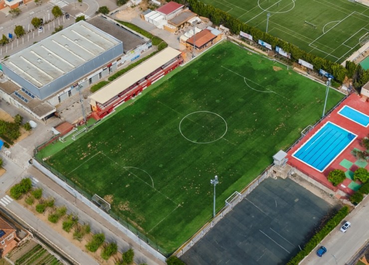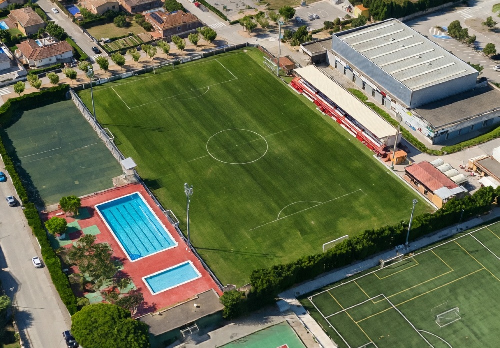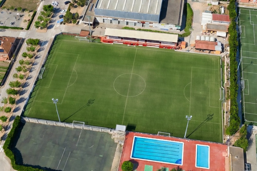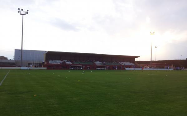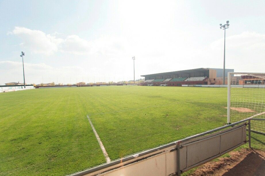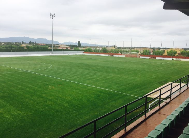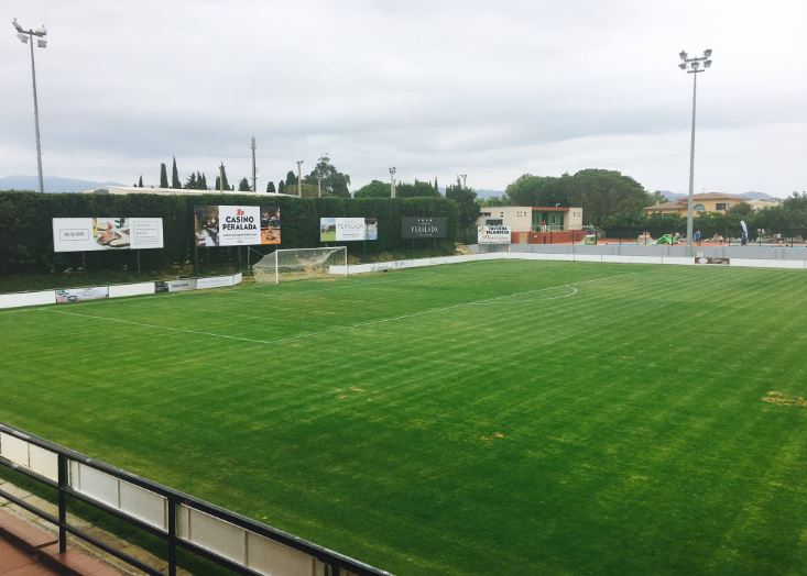 The Municipal de Peralada is situated on the northern edge of the village, within a sports complex that also features a swimming pool, tennis courts and a full-size 4G football pitch, which CF Peralada uses for training. Work originally started back in 1981, but a lack of funds meant that the club did not move in for another decade. The principal feature is the main tribuna on the western side of the enclosure. 50 metres in length, it has 480 seats which are arranged in broad bands of green & white. The seating deck is raised above the changing facilities and covered by a cantilevered roof. Hardstanding areas on the four sides of the pitch take the overall capacity to 1,500. The only other feature of note is at the north end of the enclosure. Here stands a 20-foot-high hedge that would turn the followers of Brechin City green with envy!