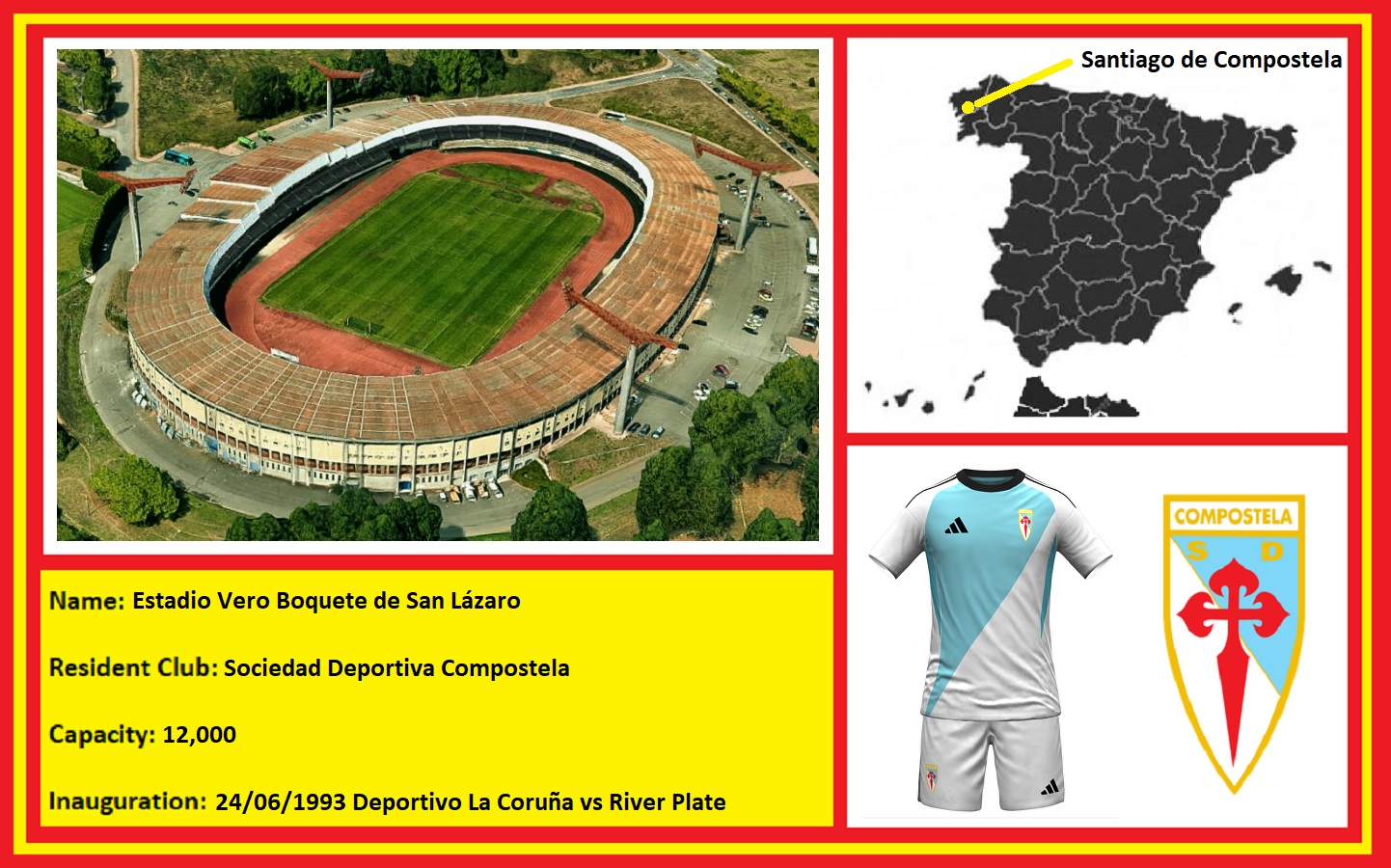 Then there is SD Campus Stellae, which moved into San Lazaro in 2006. After four seasons of languishing in the regional league, the Campus Stallae reached the Tercera for the 2008-09 season. In the following campaign, after finishing first in its group, they beat Atlético Monzón in the playoffs and won a second consecutive promotion. Now in Segunda B for the 2009-10 season, it was almost inevitable that this would be a short-lived return. Campus Stallae finished in last place, and relegation was followed by the now ubiquitous demotion due to financial irregularities. After a couple of seasons in the Regional Preferente North (Level 5), the club obtained permission to use the SD Compostela title and returned to the Tercera in the summer of 2012. This was followed a year later by a return to Segunda B. Thankfully, there has been a degree of stability since taking on the SD Compostela title, achieving four seasons in Segunda B, and is now resident in the Tercera Federación.