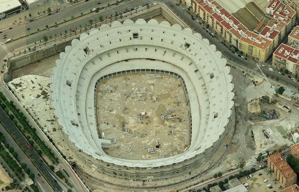 In June 2009, the club agreed on a capital release deal with Bancaja, which saw its debt rise to a mind-blowing €544m. If it hoped that this would add impetuous to completing the build, it was sadly mistaken. By now, the World Financial Crisis had Spain in its grip and the construction industry had all but ground to a halt. New housing projects, in particular, were practically non-existent, and therein was the Nou Mestalla’s fatal flaw. A large chunk of the funding was to come from selling plots of land at the old Mestalla for housing development. But with the banks not lending money and the building industry in intensive care, the club’s main asset, the city centre location on which Mestalla stood, was all but worthless. In December 2011, new club president Manual Llorente brokered a deal with Bankia that would see a reduction in club debt and the completion of the stadium by the summer of 2014. In return, Bankia would take over the sell and development of the old Mestalla site. The deal also saw a change to the original plans. Capacity would be cut to 70,000 seats and the aluminium exterior and roof would be replaced with plate glass. Strangely, these modifications were passed by Llorente’s board without any consultation with the original architect, Mark Fenwick. Needless to say, the deal faltered with Bankia breaking the agreement, indicating that the sell of the old Mestalla for housing was no longer viable over the period of the original agreement.