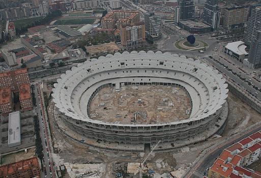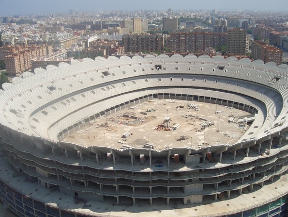 Work began on 1 August 2007, but almost immediately timescales slipped, not helped in part by the drying up of funds. In addition, Valencia was just about to have their worst domestic season for nearly 20 years and as a result would not qualify for the Champions League. With serious doubts raised over the stadium’s funding, the initial plan to complete the build by August 2010 appeared unlikely. Things were not going well on site either, as tragedy struck on 26 May 2008. Four construction workers were killed when scaffolding and a retaining wall collapsed on one of the stadium’s ten main towers. A further failure to qualify for the Champions League in 2008-09 saw the clubs debt rise to crippling levels and when in the spring of 2009, the club defaulted on several payments to the construction companies, worked stopped on the new stadium.