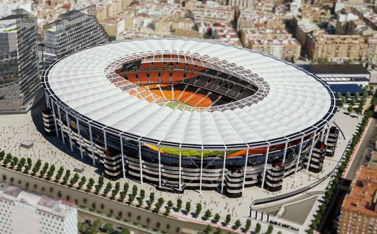 The Nou Mestalla was to be built on the site of a former factory on the Avenida Cortes Valencianas, in the North West suburb of Benicalap. It was to be designed by renowned architects Reid Fenwick Asociados, who were already working on RCD Espanyol’s new home in Cornellà-El Prat. The new stadium would seat 75,100, have all the corporate facilities that are a necessity for any modern arena, a club museum, parking for 3,500 and have UEFA’s highest 5-star rating. The cost of the project would be €340m, of which €220m would be the cost of the stadium, with the rest being spent on commercial, entertainment and retail units. The original design was striking, to say the least. The stadium was to be clad in aluminium, with the roof panels denoting Valencia’s neighbourhoods. Light would pierce through glass sections of the roof and walls, representing the Rio Turia as it cut its way through the city.
