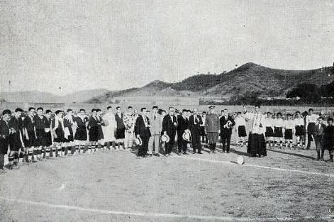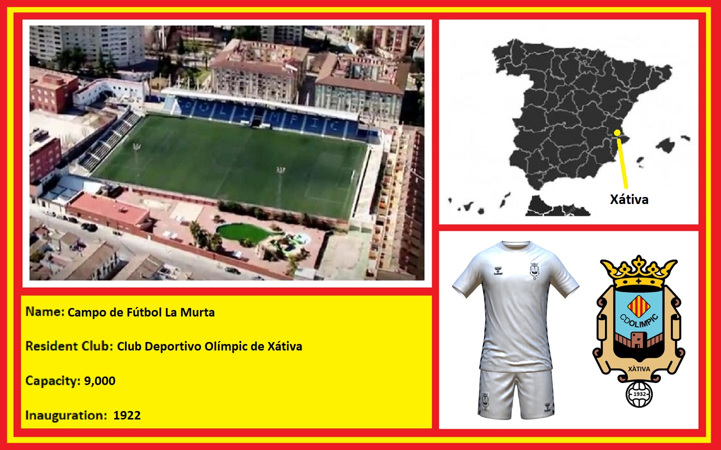 Football first emerged in the city in the early 1920s when soldiers stationed at the local barracks played on a makeshift pitch within the compound. In 1922, the local council opened the Campo de La Murta, after members and supporters of Racing Club de Xátiva had requested a permanent playing field. The club changed its name to Club Deportivo Xátiva at the end of 1922 and joined the local federation in June of 1923, competing in the regional second tier for several years before folding in 1928. Following CD Xátiva’s demise, several local clubs were formed, one of which, Club Deportivo Olímpic, was established in the summer of 1929, playing matches at the Instalaciones del Regimiento Otumba nº49 (the army barracks mentioned above). The barracks were closed in 1931 when the regiment relocated to Alcoy, so Olímpic moved to the Campo de La Murta, paying the council an annual rent of 500 pesetas. On 12 September 1932, Olímpic joined the Valencian Federation, and also switched from its original colours of yellow & black striped shirts and white shorts, to an all-white kit.