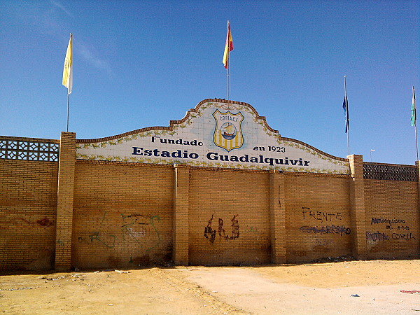 The Estadio Guadalquivir is on the southeastern edge of town, hemmed in on two sides by houses and shops, whilst the silty river runs along its entire eastern side. It is almost certain that this area was used for football and other sports before the club cordoned off this sandy patch of land in March 1923. Nothing remains of the original layout, but that doesn’t detract from this quintessential lower league enclosure. The main stand dates back to the mid-1980s and spans 55 metres across the halfway line. Running the full length of the eastern side is a raised covered stand with five rows of concrete bench seating. This was built in 2002 as part of the major redevelopment of the stadium, which also saw new changing facilities added to the club buildings situated on the western side of the ground, which is accessed through a tunnel just to the side of the main stand. An open terrace stands at the southern end of the ground, whilst an area of hard standing is located behind its northern counterpart. In all, the Estadio Guadaquivir has a capacity of 6,000.