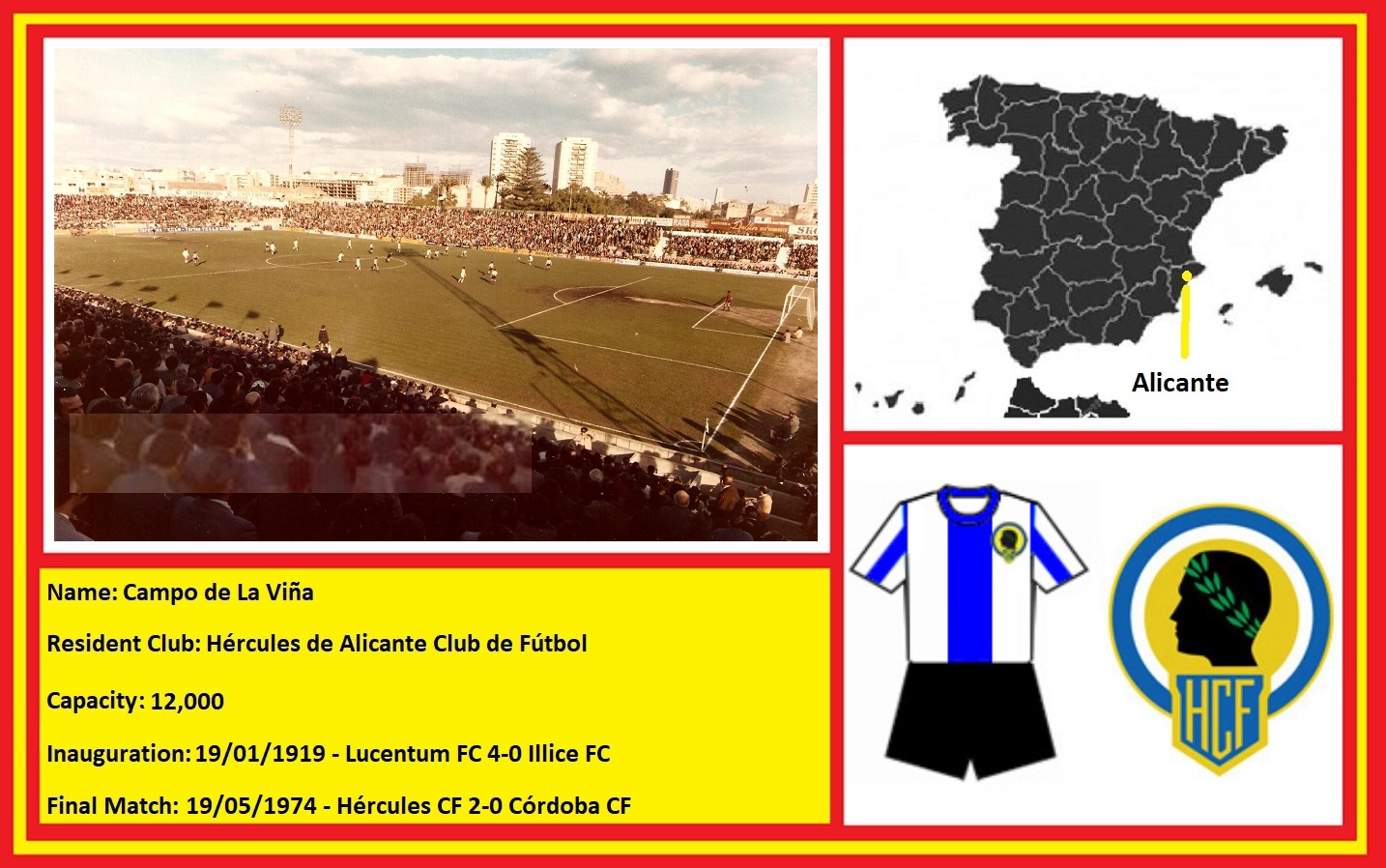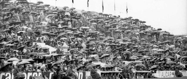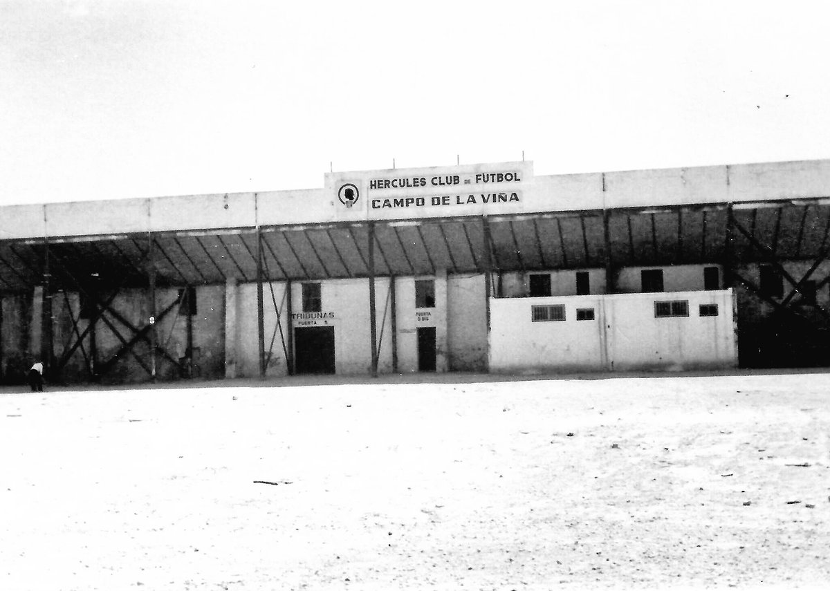 Hércules returned to a renovated Campo de la Viña for the start of the 1954-55 season. Unlike the Campo de Bardín, La Viña did not have a covered stand. It did, however, have a higher capacity of 12,000 and resembled the Campo de Altabix, home of near-neighbours, Elche CF. It was basic, but acceptable by 1950s standards, featuring a large open tribuna on the west side and a slightly smaller preferencia terrace on the east side. Both end terraces were slightly curved, with the southern one being the larger of the two. After two seasons in the top flight, Hércules dropped to La Segunda. Worse was to follow in 1959, when the club was relegated to the regional Tercera. The league title was secured a year later, thanks in no small part to the 17 goals scored by a 21-year-old loanee, a certain Luis Aragonés. Playoff victories over Manacor and CE Hospitalet secured Hércules’ return to La Segunda. Remarkably, La Viña was not finished as a top-flight stadium, as Hércules won a place back at the top table in 1966. The club had struggled financially for much of the past two decades, but things were about to change.