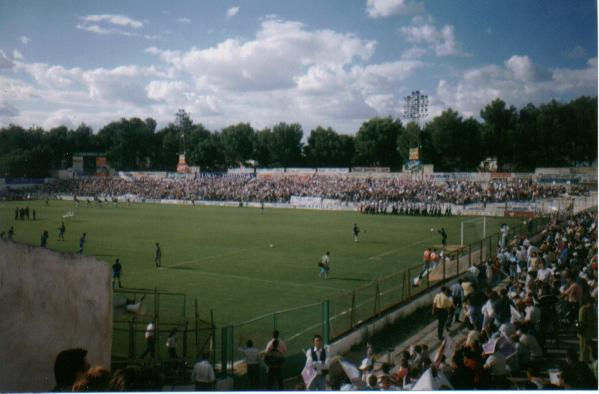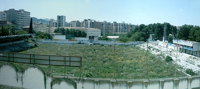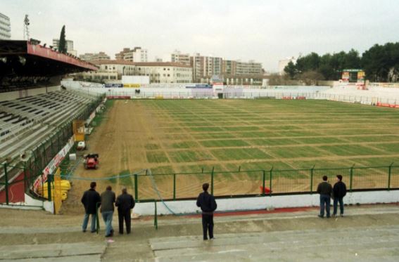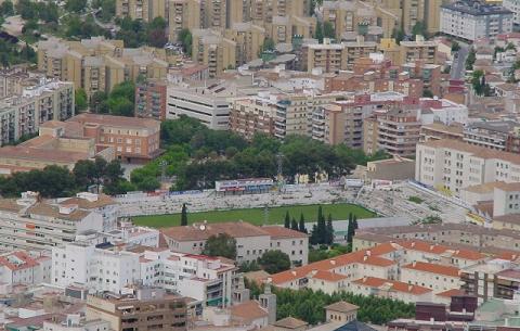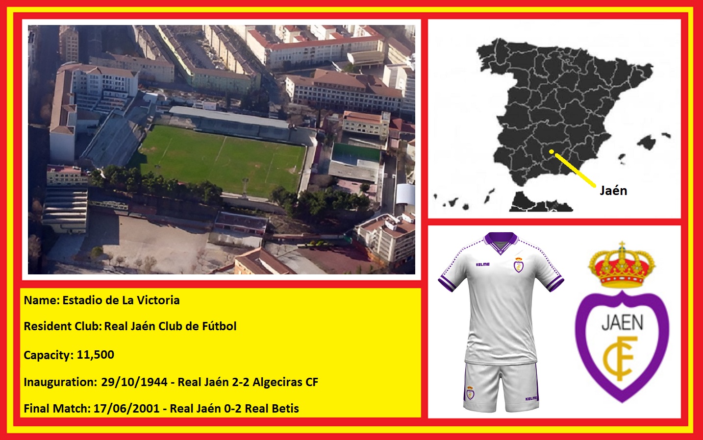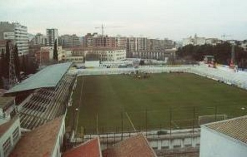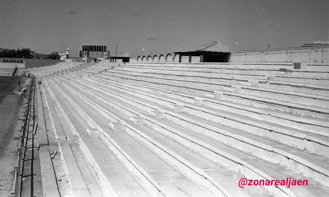 La Victoria was a particularly compact stadium in the heart of the city, surrounded on two sides by tenements, and the Colegio El Almadén and Escuela Politécnica Superior. The old stadium remained open to the elements until 1981, when an upper seated tier and a low cantilevered roof were added to the south terrace. The press facilities were also moved at this time, from a little box that sat atop the south terrace to a more substantial structure that stood on stilts above the north terrace. Bench seating was installed on the remaining areas of terracing when Jaén made it back to the second division for the 1997-98 season.