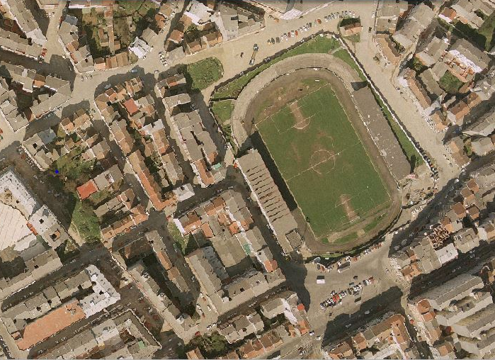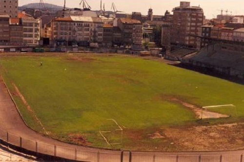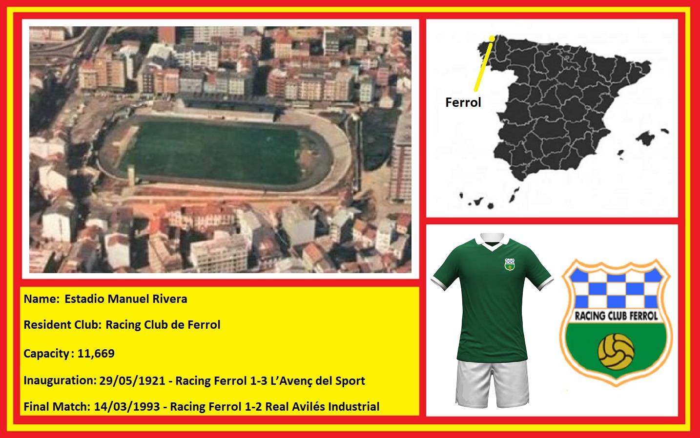 Time was called on Estadio Manuel Rivera in 1993. Originally, the final match was due to take place on 28 February 1993, when the club entertained UD Salamanca, and 200 former players were guests of honour. However, delays with the new stadium meant that Racing played their last fixture at the stadium on 14 March 1993, when Real Avilés Industrial won 1-2. The club had to wait to use their new stadium, playing the home match vs Toledo on 4 April 1993, 10 miles to the north of Ferrol, at the Campo Misael Prieto, the home of Meirás CF. Two weeks later, the club pitched up at A Malata, the new municipal stadium, a mile north-west of the town centre. Demolition of the old stadium commenced on 25 May 1993. Today, you will find an ageing shopping centre and a pleasant square on the site of the old stadium. The square is named the Praza do Inferniño, and on its southern edge, you will find a marble replica of a corner segment of the pitch. Inspired by a similar tribute on the site of Racing Santander’s old Campos de Sport de El Sardinero, it’s a simple but effective reminder of the thousands of matches played at El Inferniño.