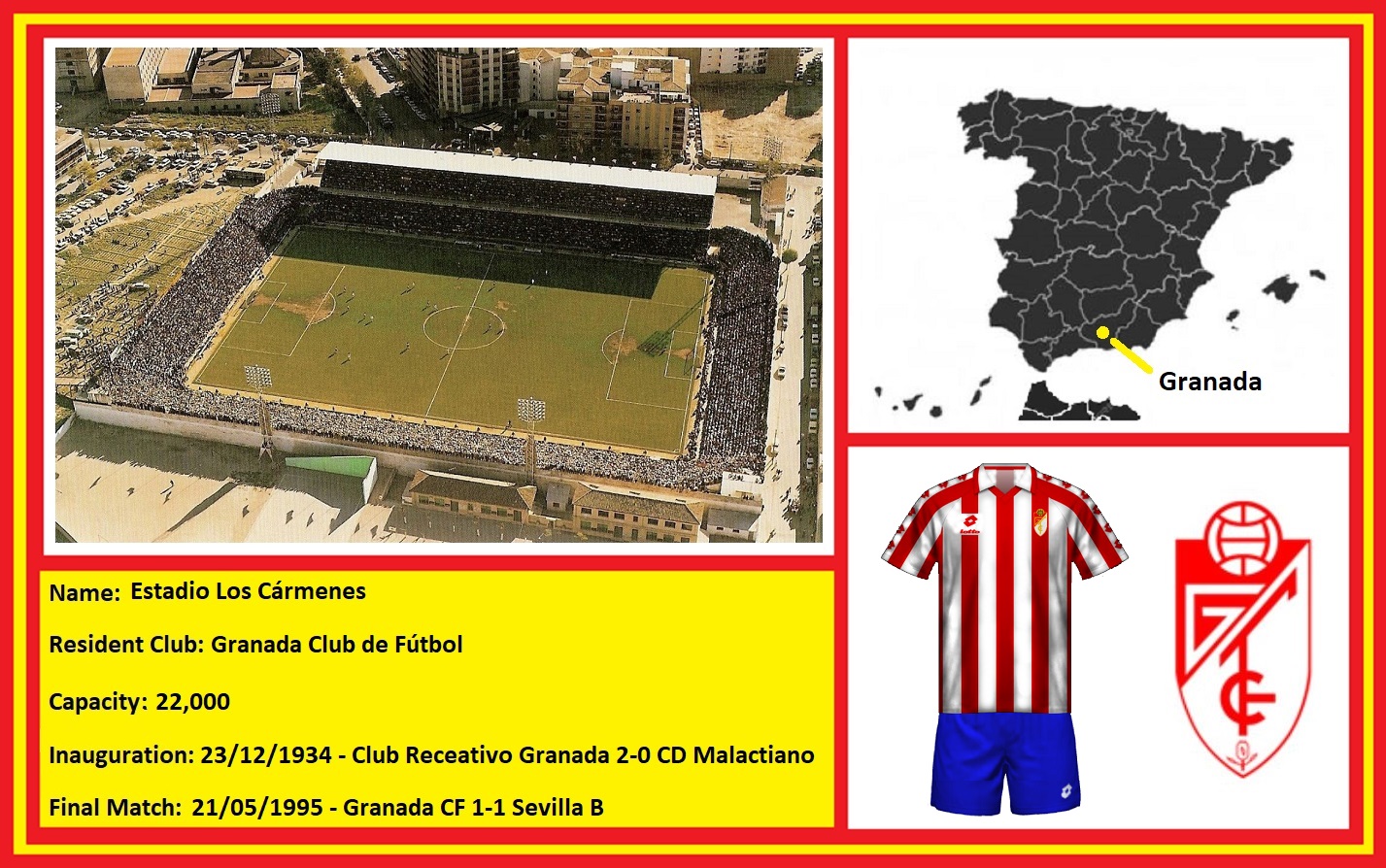 The national team played two full internationals at the old Los Cármenes. Cyprus was the first visitors in 1971, and they were sent packing with a 7-0 defeat. Next up was Mexico, which Spain beat 2-0 in 1978. Los Cármenes also staged a B International, with Spain hosting England on 25 March 1981 and prevailing 3-2. Except for the building of the new stand in the late 1960s, Los Carmenes remained relatively unaltered and unadorned throughout its 60 years as a football ground. It had the indignity of being used as a car park for a few years before being demolished in the late 1990s. The site is now covered in apartments, but at least the ground is remembered on Calle del Granada Club de Fútbol, which runs along the northern perimeter of the old ground.