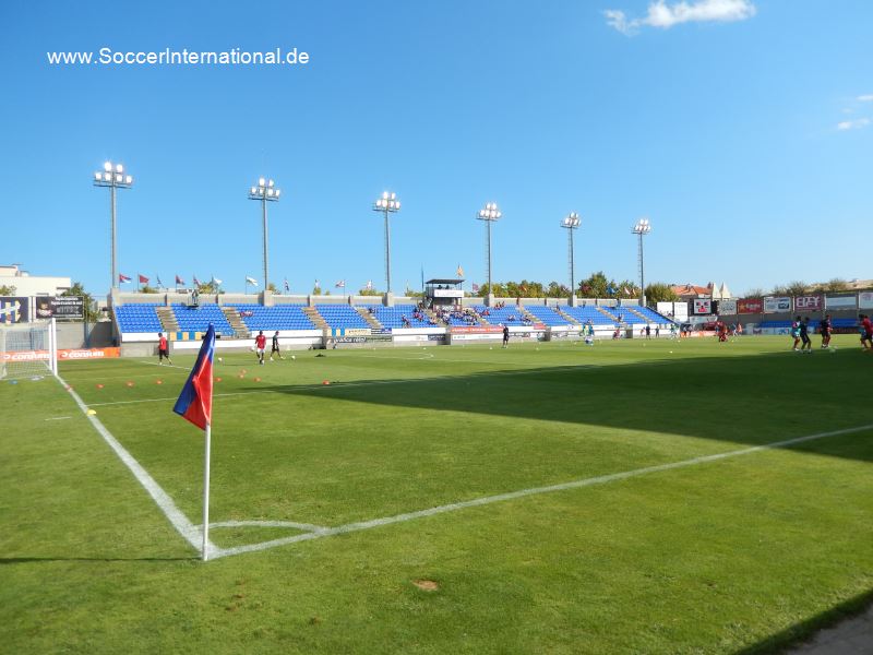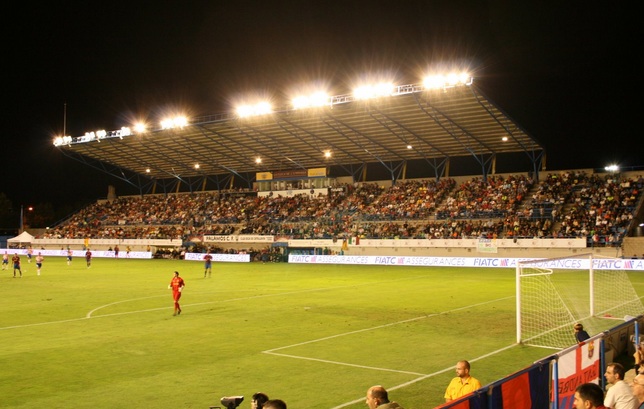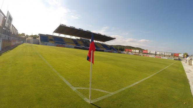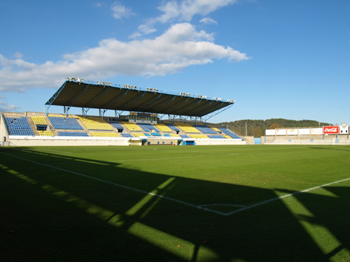 The Nou Estadi is simple, bright and functional and I rather like it. Naturally, one’s eyes are drawn to the main stand with its raised deck full of yellow & blue seats. This seating deck extends nearly the full length of the pitch, however, the cantilevered roof does not, sitting over the middle 70 metres or so, leaving the ends exposed. That said, such is its rake and flimsy nature, one wonders what protection it does offer. The north & south ends of the stadium are served by a few rows of blue seats, whilst the eastern side has more substantial seating, with nine rows running the length of the pitch. Six floodlight pylons run along the back of the east terrace, whilst unusually, access is gained to it via five stairways at the front. The stadium has a seated capacity of 5,824.