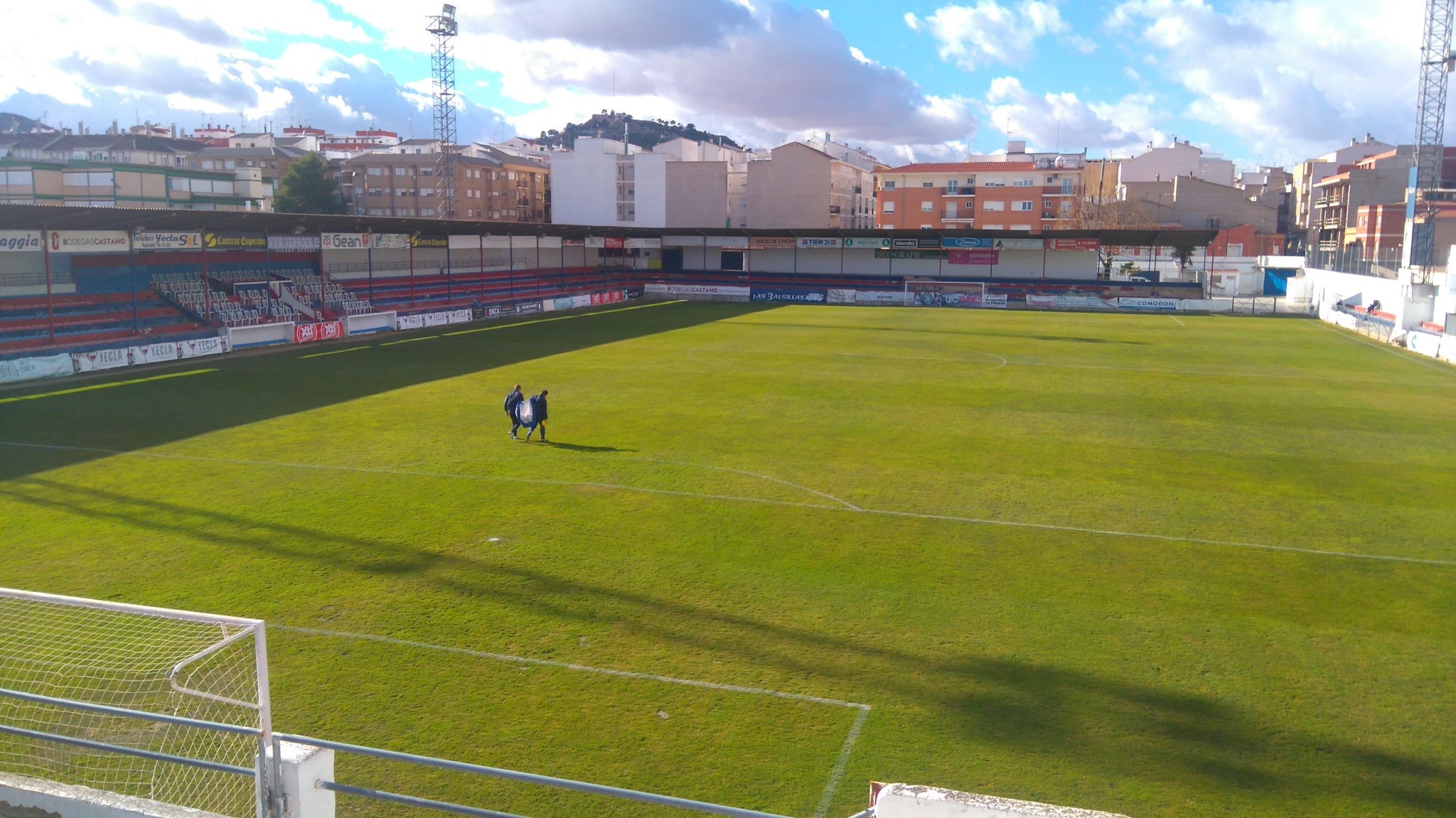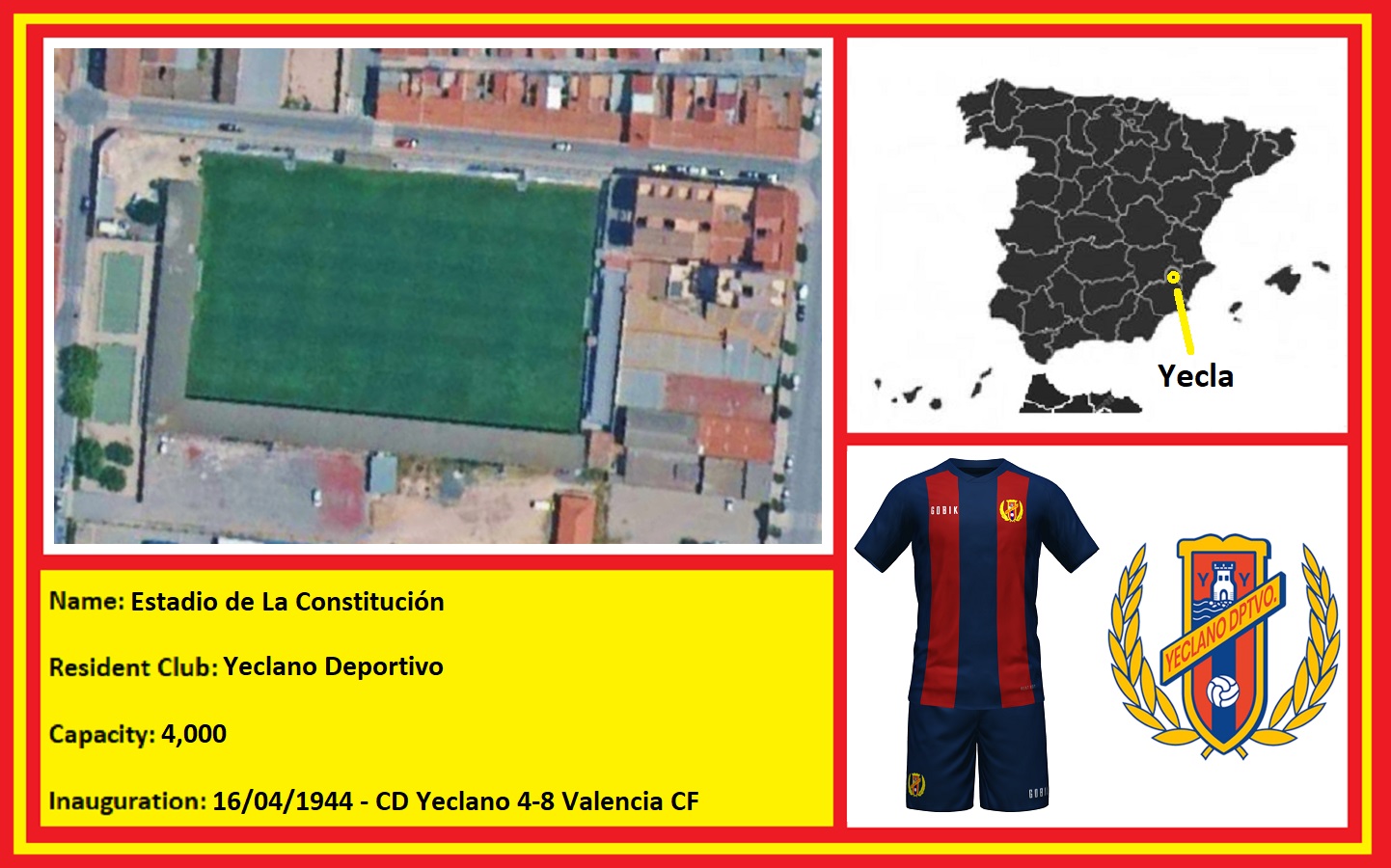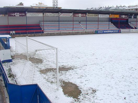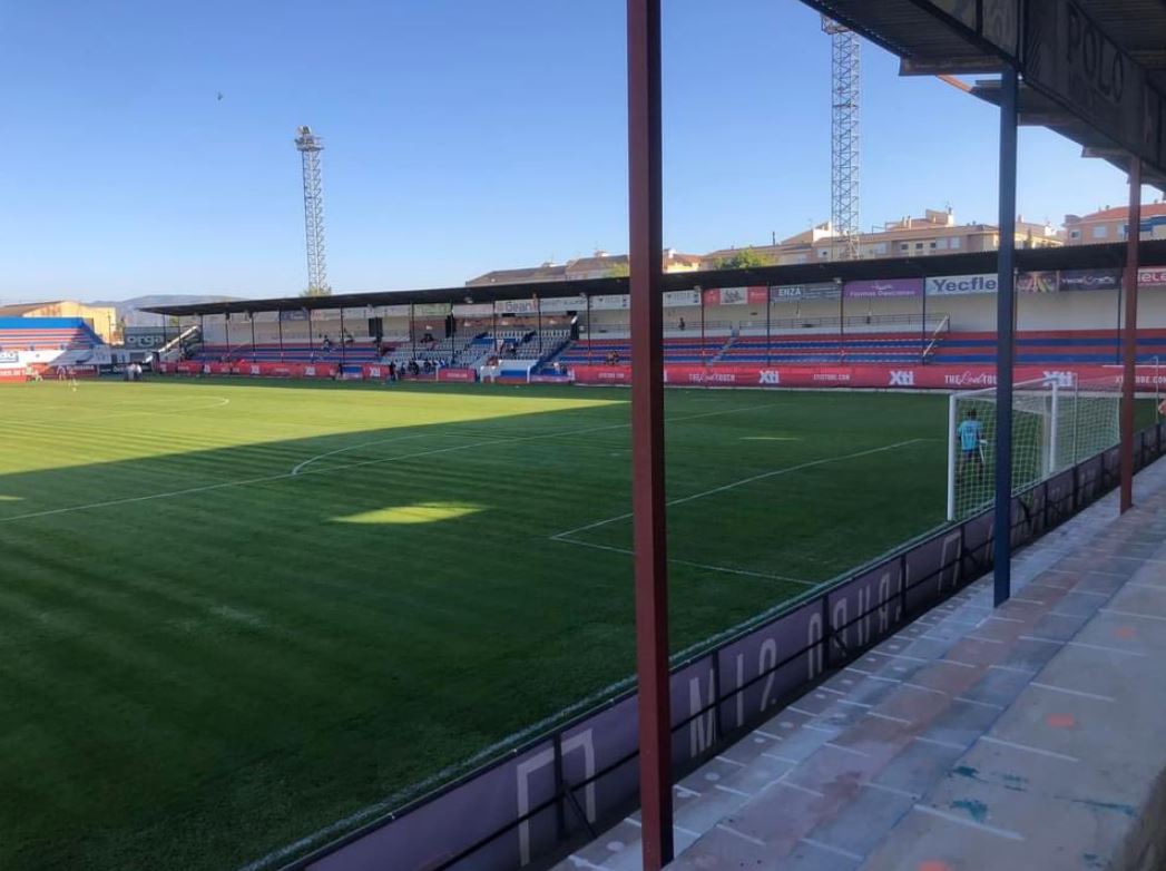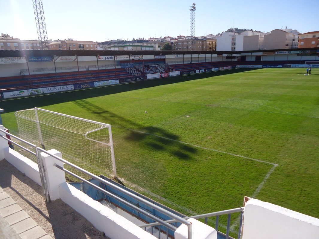 In 1941, a group of footballers from the former amateur clubs of Estrella FC and Yecla FC formed Club Deportivo Español. The club made repairs to the Campo de la Estación, but its narrow dimensions made it unsuitable for further development. The club raised funds, and with the help of the local council, a plot of land was acquired at the end of Calle Cruz de Piedra. The Municipality had the aim of developing a sports city, which in addition to the football field was to have included tennis and basketball courts. As a result, the ground was named Campo de Deportes and was inaugurated on 16 April 1944 with a match against the Spanish Champions, Valencia, in front of 2,000 spectators. On opening, the ground featured wooden bleachers on the southern side of the ground and changing facilities in the northeast corner. By now, CD Español had changed their name to Club Deportivo Yeclano. The club reached the Tercera in 1953, but finances again proved to be a problem, and in April 1958, the club folded after failing to complete their fixtures.