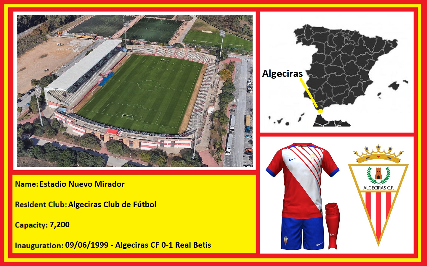 The 1990s were not particularly kind to Algeciras, with the club becalmed in the Tercera for the majority of the decade. Whilst things may have stagnated on the pitch, moves were afoot off it. The club sold its prime waterfront location to the local municipality, who in return built a new stadium on an industrial estate to the northwest of the town. The old Estadio El Mirador did get one last season in the spotlight after Algeciras won promotion to Segunda B in 1998. Unfortunately, 1998-99 was a season of struggle, and a sixteenth-place finish saw the club enter the relegation playoffs. There was to be no fairy tale finish for the old stadium, however, as on 20 June 1999, Algeciras beat Caudal Deportivo 1-0, but lost 2-1 on aggregate and was relegated to the Tercera. The Estadio Nuevo Mirador was actually inaugurated 11 days before the old stadium’s last match with a friendly against Real Betis. Pre-season training was conducted at the old stadium before it was demolished and replaced with a Corte Inglés department store and shopping mall.
