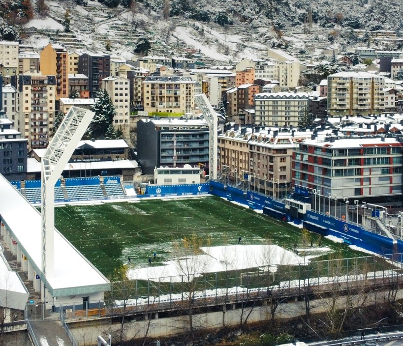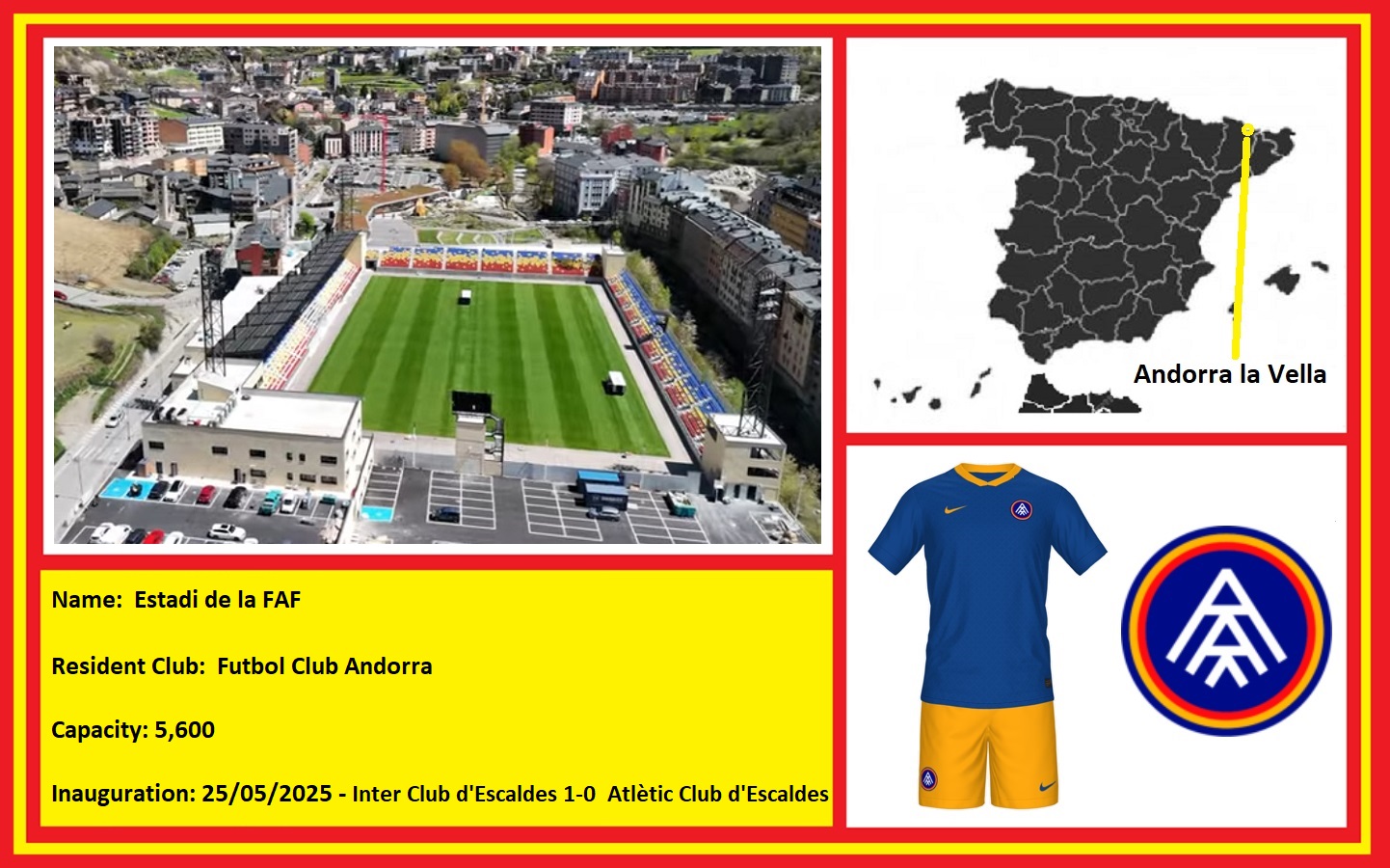 In 2022, plans were announced for a new national stadium, located approximately 400m northeast of FC Andorra’s previous home, the Camp de Fútbol de Prada de Moles. Progress on the €15m stadium was slow, and in the intervening years, despite some posturing from the Kosmos Holding Group, FC Andorra stayed at the Estadi Nacional. The new stadium, named the Estadi de la FAF, finally opened its doors on 25 May 2025, when the final of the Copa Constitució, the national cup competition, was held. Despite Gerard Piqué saying that the club would never play back in Encamp at the new stadium, on 1 June 2025, a crowd of 3,141 watched as FC Andorra beat UD Ibiza 2-0 in the first leg of the promotion playoffs. Promotion back to La Segunda was achieved following a two-legged victory over Ponferradina.