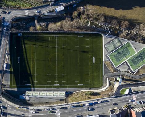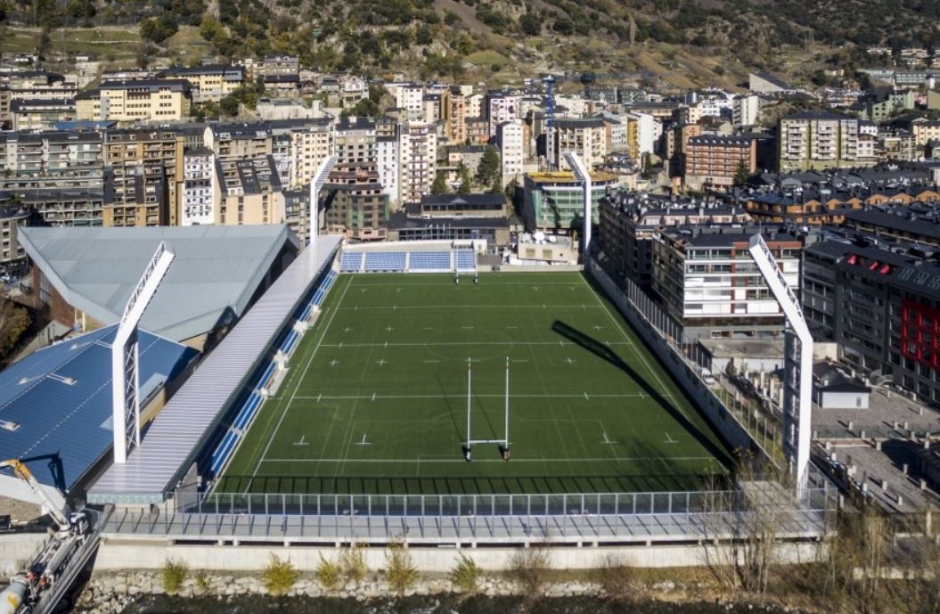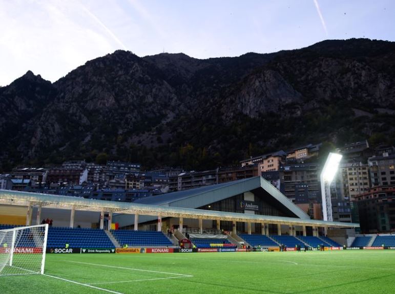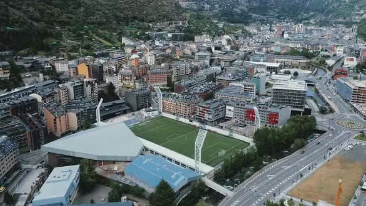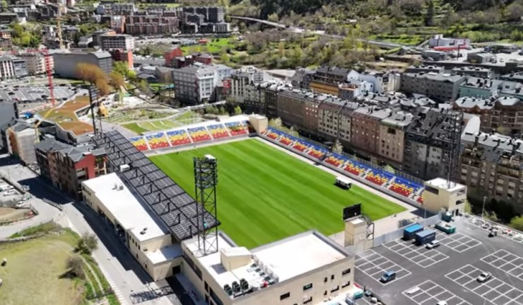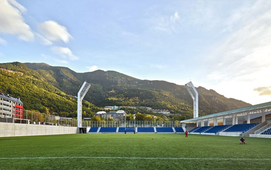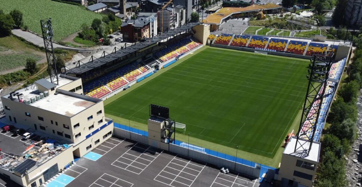 The Estadi Nacional is owned by the Andorran Government, which funded the €5.1m build with the help of a €2m grant from UEFA. Situated 1023m above sea level, Europe’s highest national stadium hosted its first match on 9 September 2014, when the Andorra national team lost 1-2 to Wales. Unlike its location, the stadium’s design is rather featureless. One full-length covered stand runs down the western side of the stadium; there are two uncovered, seated stands at each end and nothing on the eastern side of the ground, apart from a new television gantry (the first burnt down on the eve of Andorra’s match with England in October 2021) and some substitute benches. Whilst four oversized floodlight pylons break the monotony, the most interesting architectural feature on view doesn’t belong to the Estadi Nacional, but the Poliesportiu d’Andorra. The gabled roof of the indoor arena hangs high over the northern end of the main stand, and its 5,000 seats outrank the Estadi Nacional’s capacity of 3,347.
